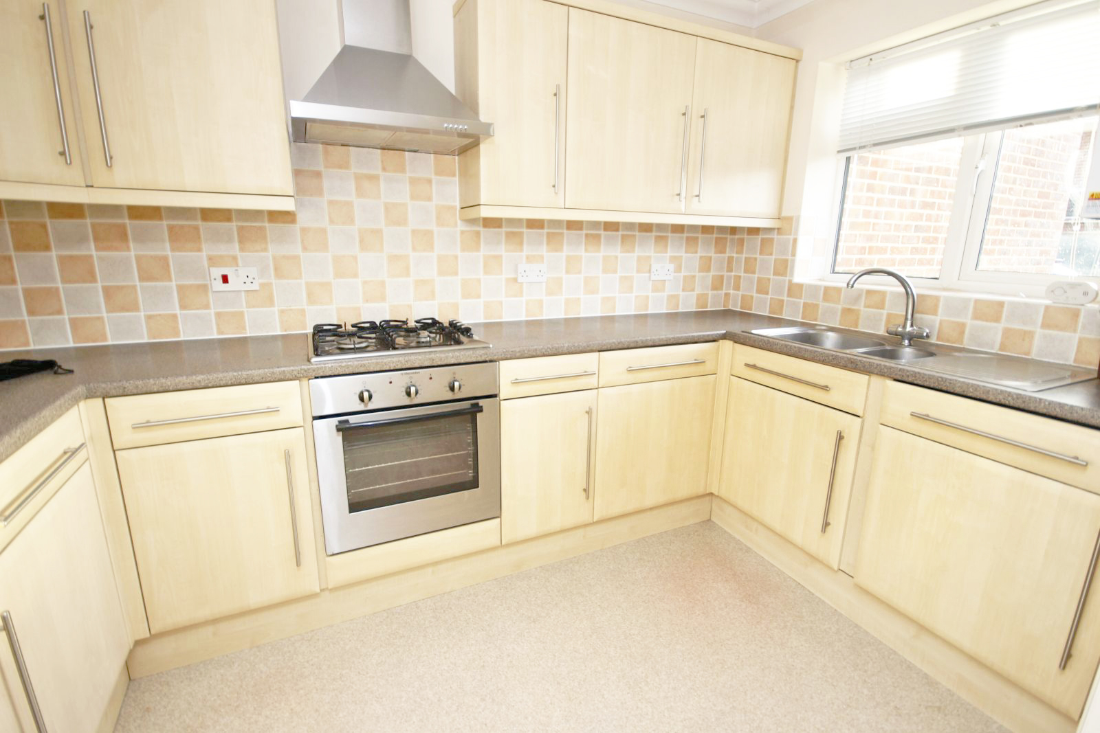 Fitted with a range of work surfaces to three walls with one and a half bowl single drainer stainless steel sink unit with mixer tap. Base cupboards and drawers below. Inset four burner gas hob with electric oven below and cooker hood over. Three quarter height units with space for upright fridge/freezer. Wall storage cupboards. Part tiled surrounds and aspect to the rear. Wall mounted gas fired boiler. Coved ceiling. Vinyl flooring.