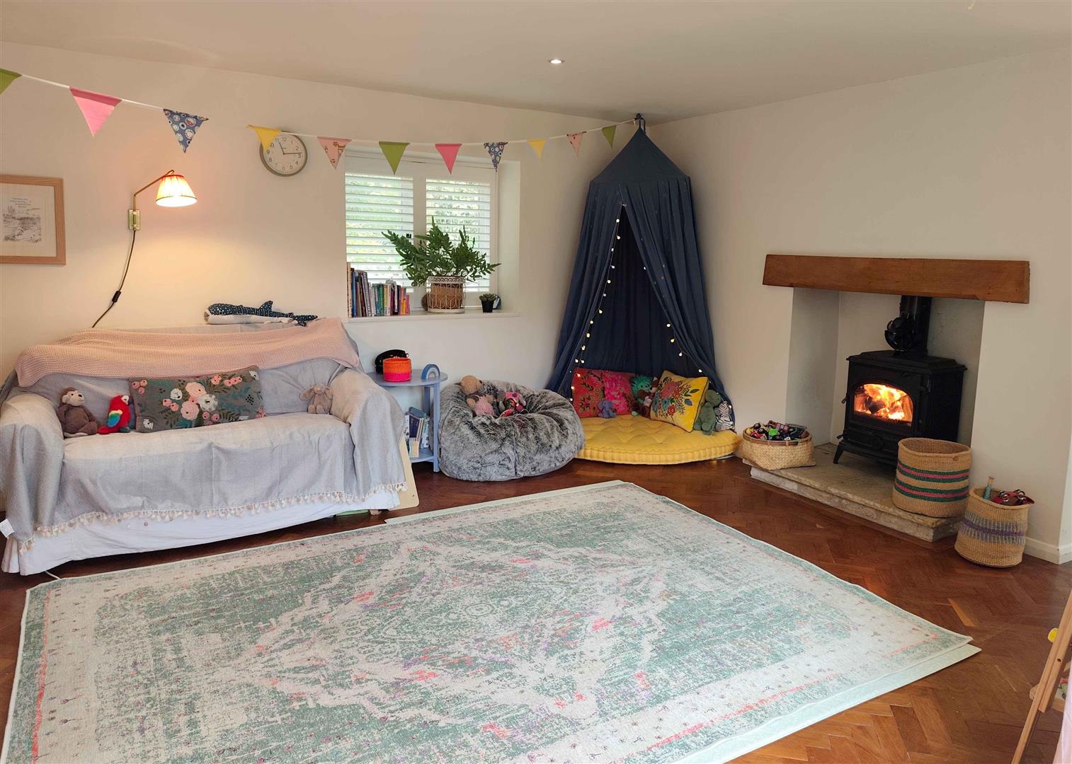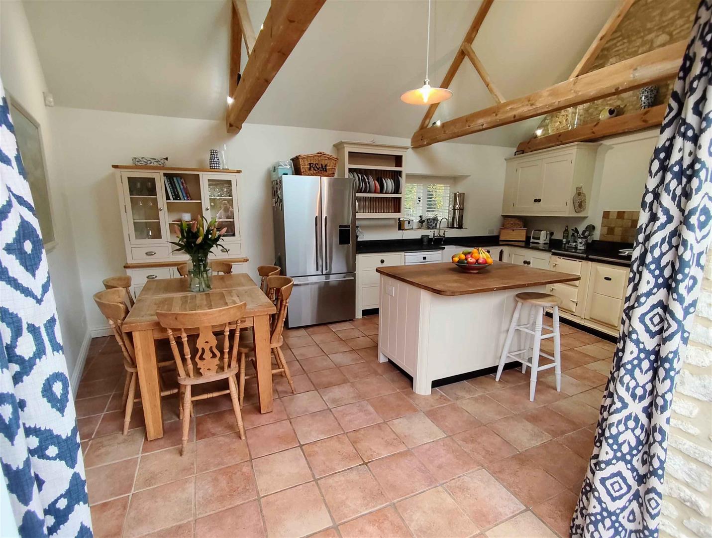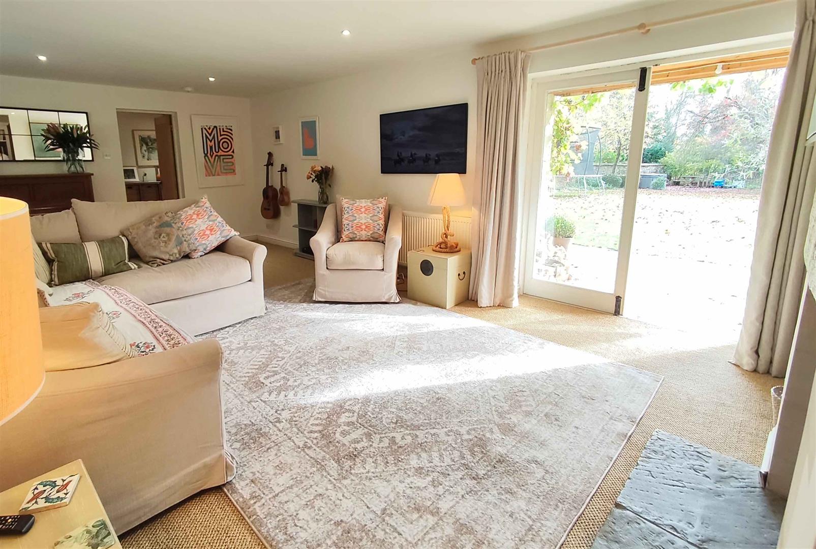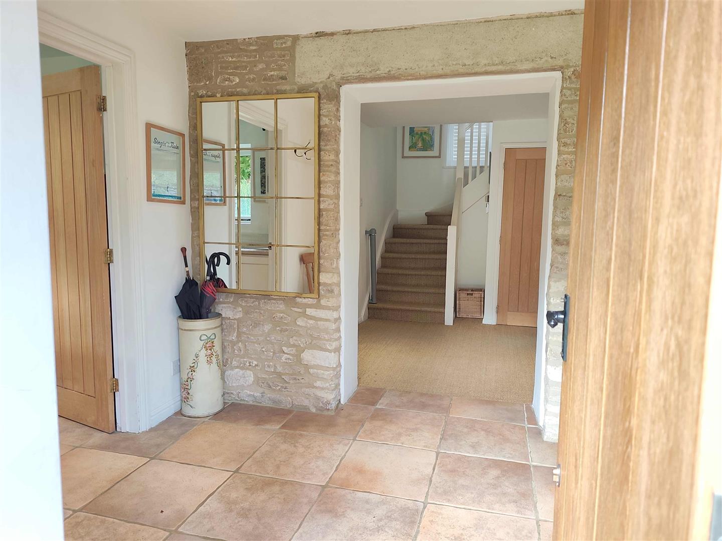 The hallway leads through to the inviting living room, complete with a cosy wood-burning stove and French doors that open onto the garden, creating a seamless flow between indoor and outdoor living. Opposite the living room, the snug/playroom offers a versatile space for children to play or for hosting guests, with its own set of doors to the garden as well as a wood burning stove. The heart of the home is the light and airy kitchen, where exposed Cotswold stone walls and wooden beams add warmth and charm. An AGA takes pride of place, and a dining table for six makes this the perfect spot for family meals or relaxed entertaining.