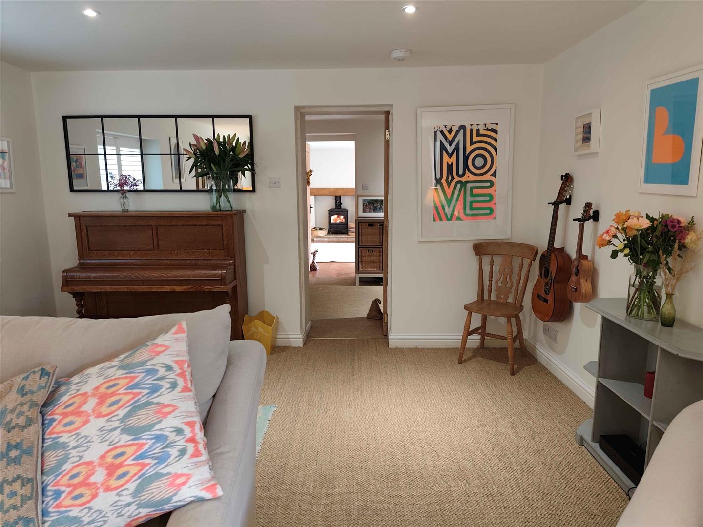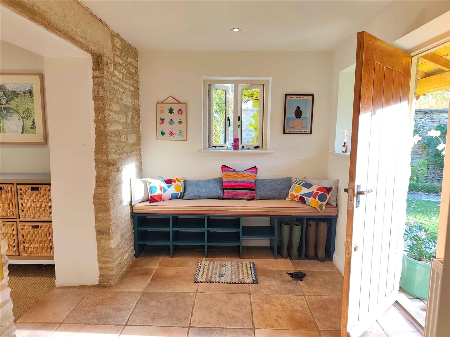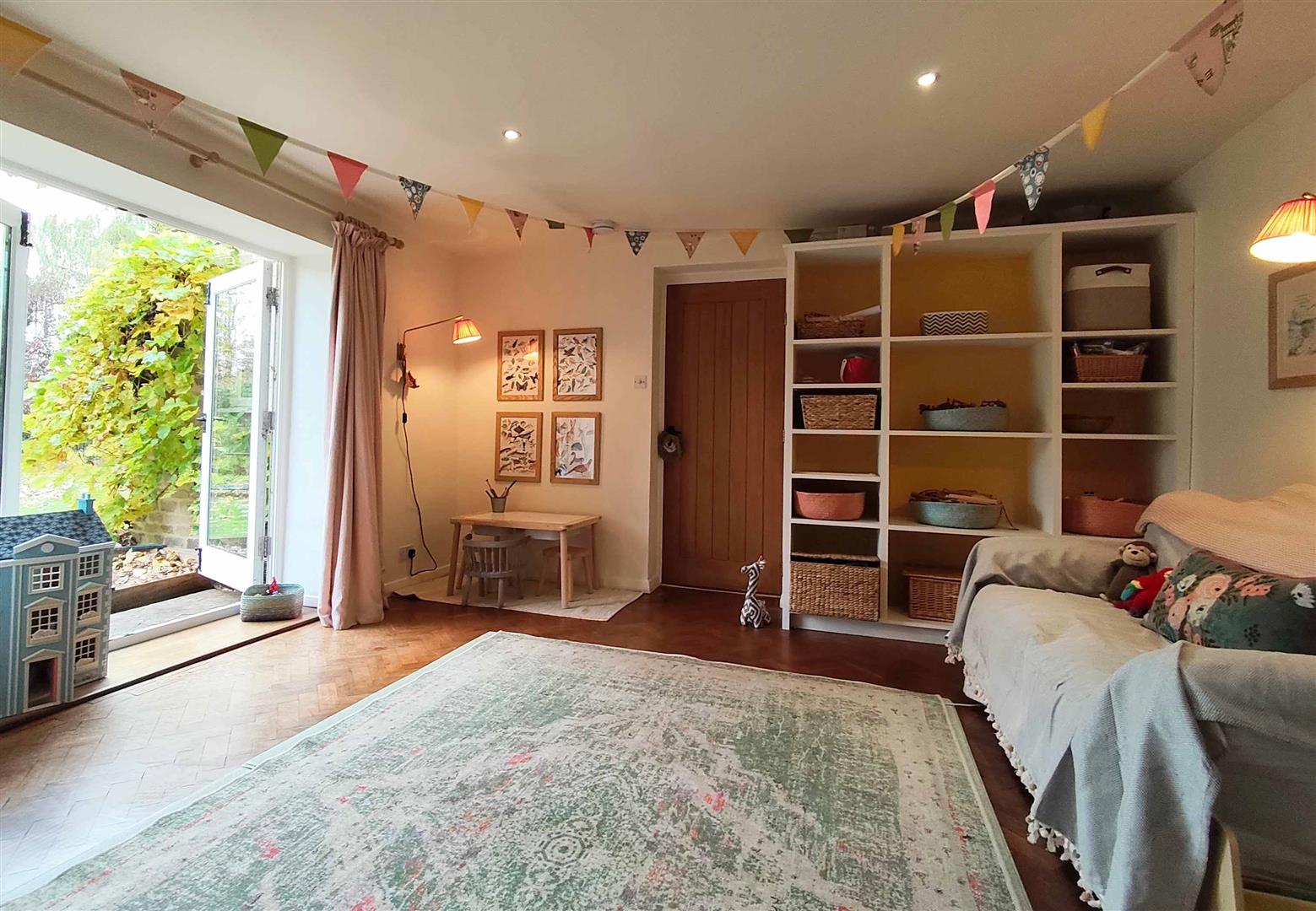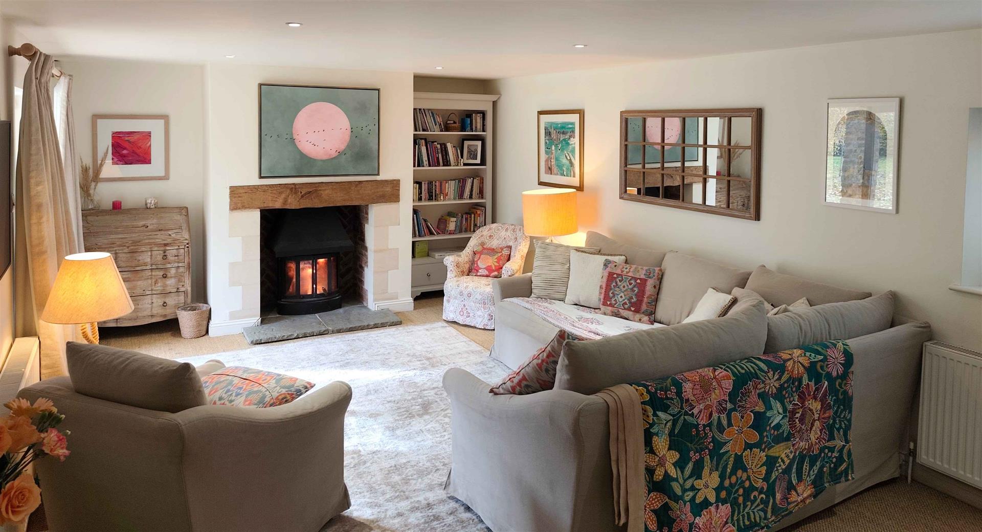 The hallway leads through to the inviting living room, complete with a cosy wood-burning stove and French doors that open onto the garden, creating a seamless flow between indoor and outdoor living. Opposite the living room, the snug/playroom offers a versatile space for children to play or for hosting guests, with its own set of doors to the garden as well as a wood burning stove. The heart of the home is the light and airy kitchen, where exposed Cotswold stone walls and wooden beams add warmth and charm. An AGA takes pride of place, and a dining table for six makes this the perfect spot for family meals or relaxed entertaining.