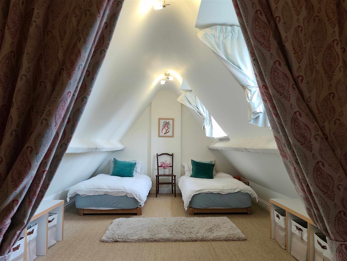 Upstairs, the master bedroom offers a calm and contemporary retreat, featuring a modern en-suite shower room. A delightful children's bedroom with twin beds and a stylish family bathroom with a bath complete the first floor. The second floor reveals a charming loft room with two single beds, slanted ceilings, and storage space.