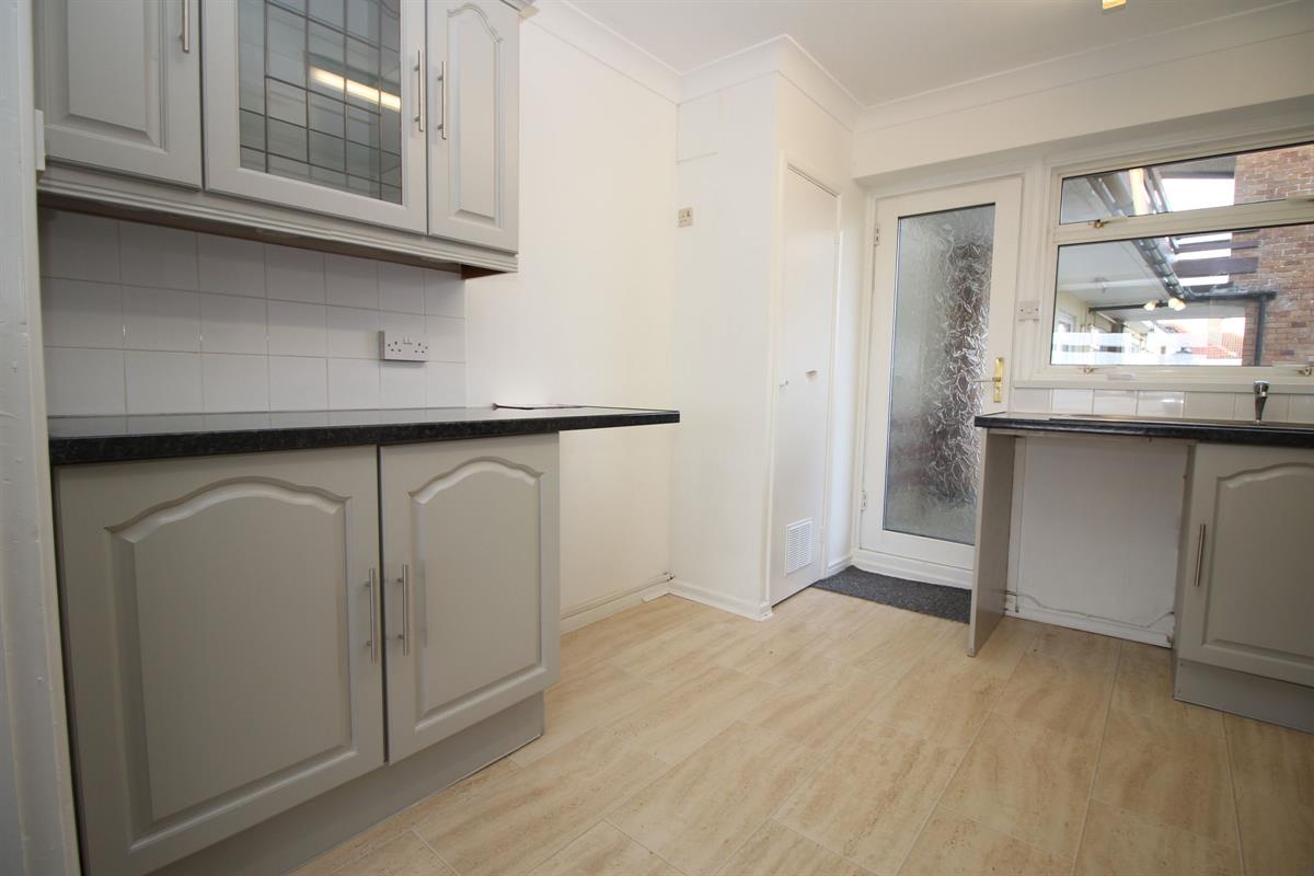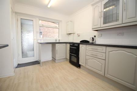Double drainer stainless steel sink unit set in roll edge work surfaces, matching base and eye level units, space for appliances, laminate flooring, coved and skimmed ceiling, double glazed window and door to rear leading via communal passage and stairway to communal garden.