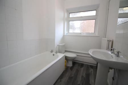White three piece suite comprising of roll edge bath with shower over and shower screen, low level W.C. and wash hand basin, tiled splashbacks, radiator, obscure double glazed window.