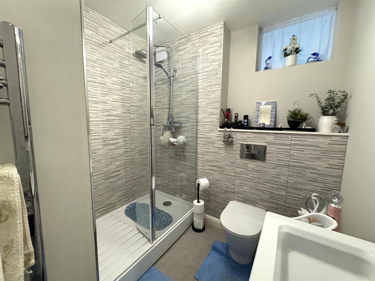 Modern fitted three piece suite comprising of enclosed double shower unit, low level w.c, pedestal wash hand basin and heated towed rail. Double glazed obscure UPVC window to side.