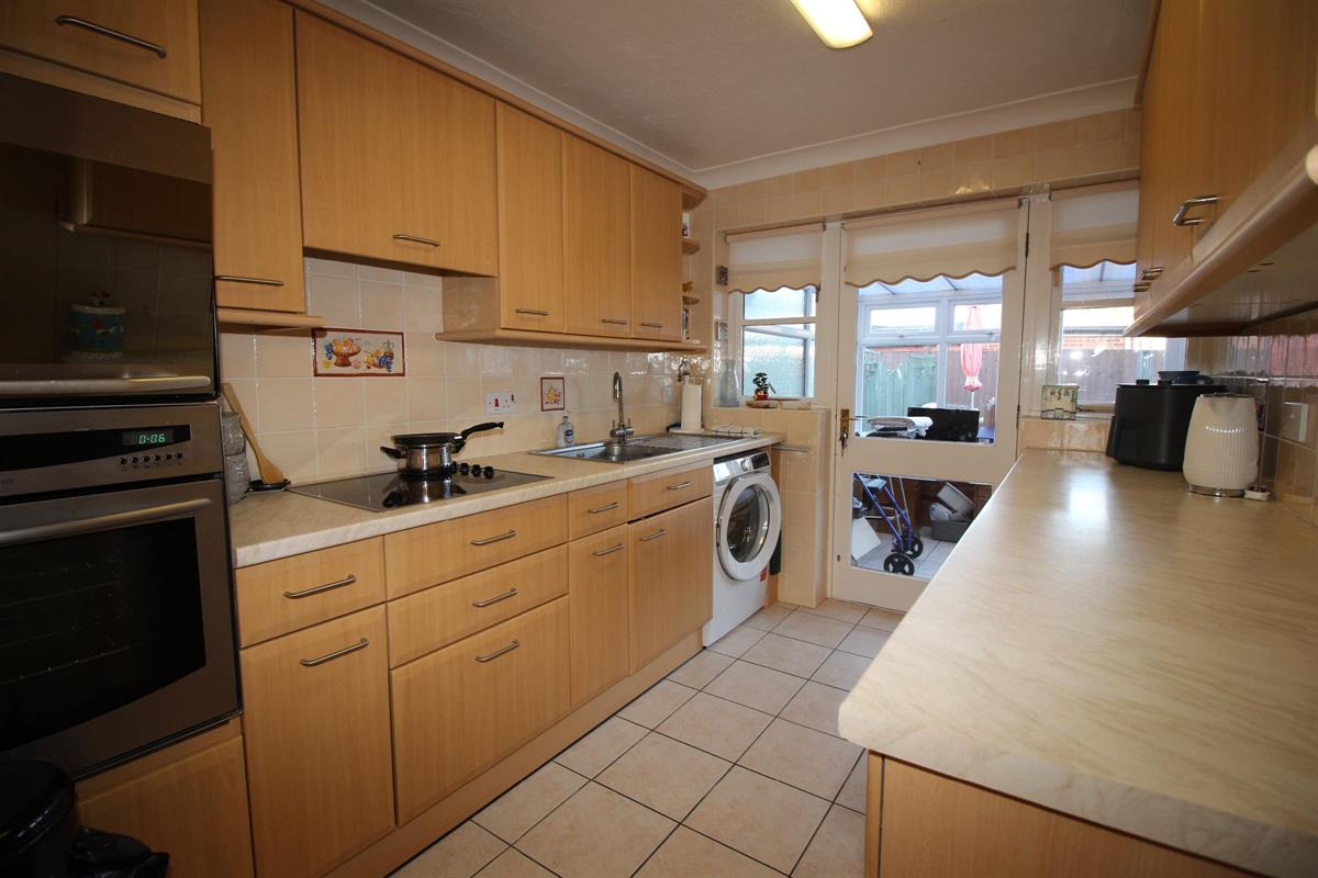 Fitted kitchen comprising of single drainer sink unit with mixer taps set in roll edge work surface, further work surfaces with range of matching base and eye level units, inset electric hob with integrated extractor hood over, built in eye level oven with enclosed space for microwave over, integrated low level fridge and freezer, space for washing machine, tiled flooring, coved and textured ceiling, two windows to rear and door to