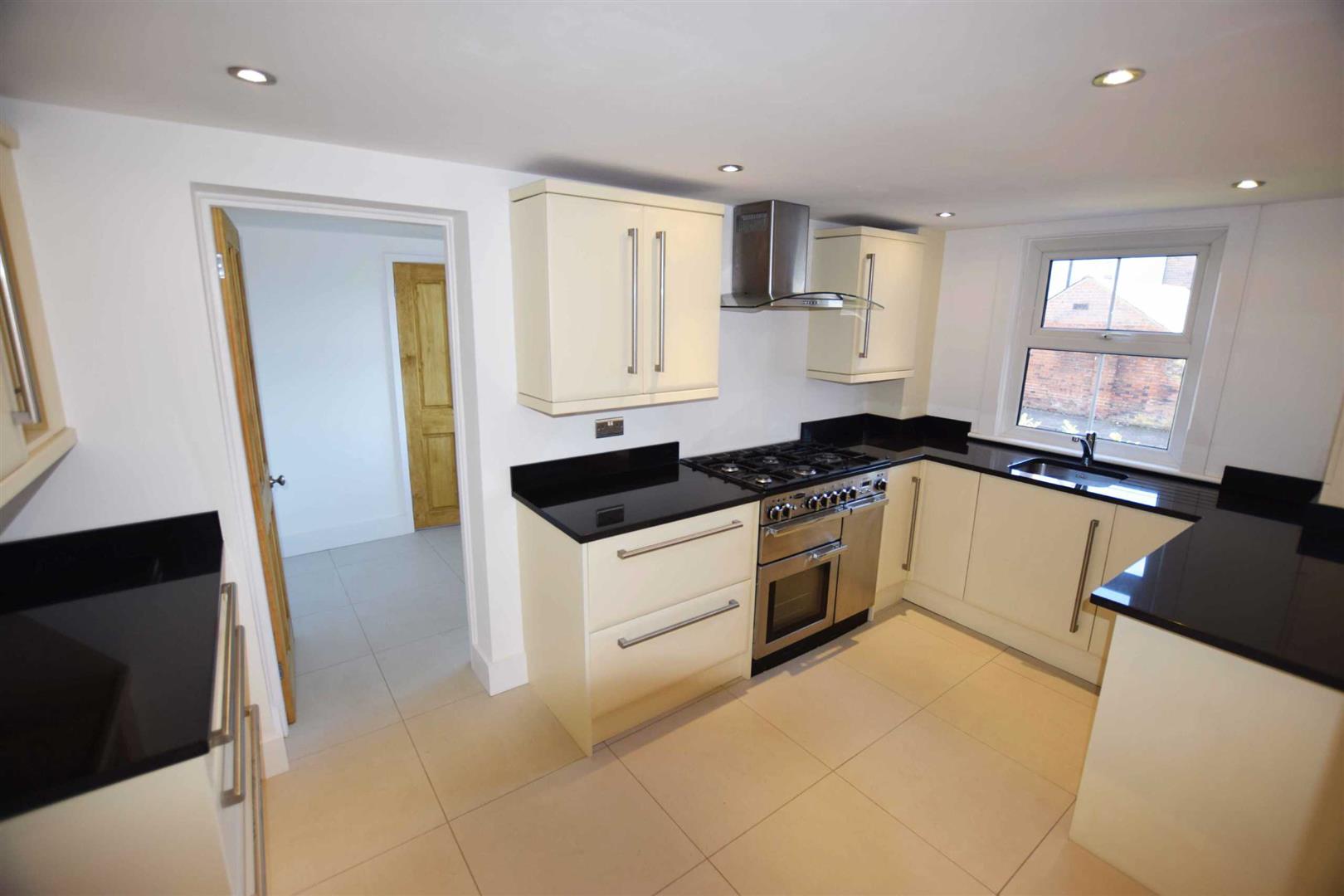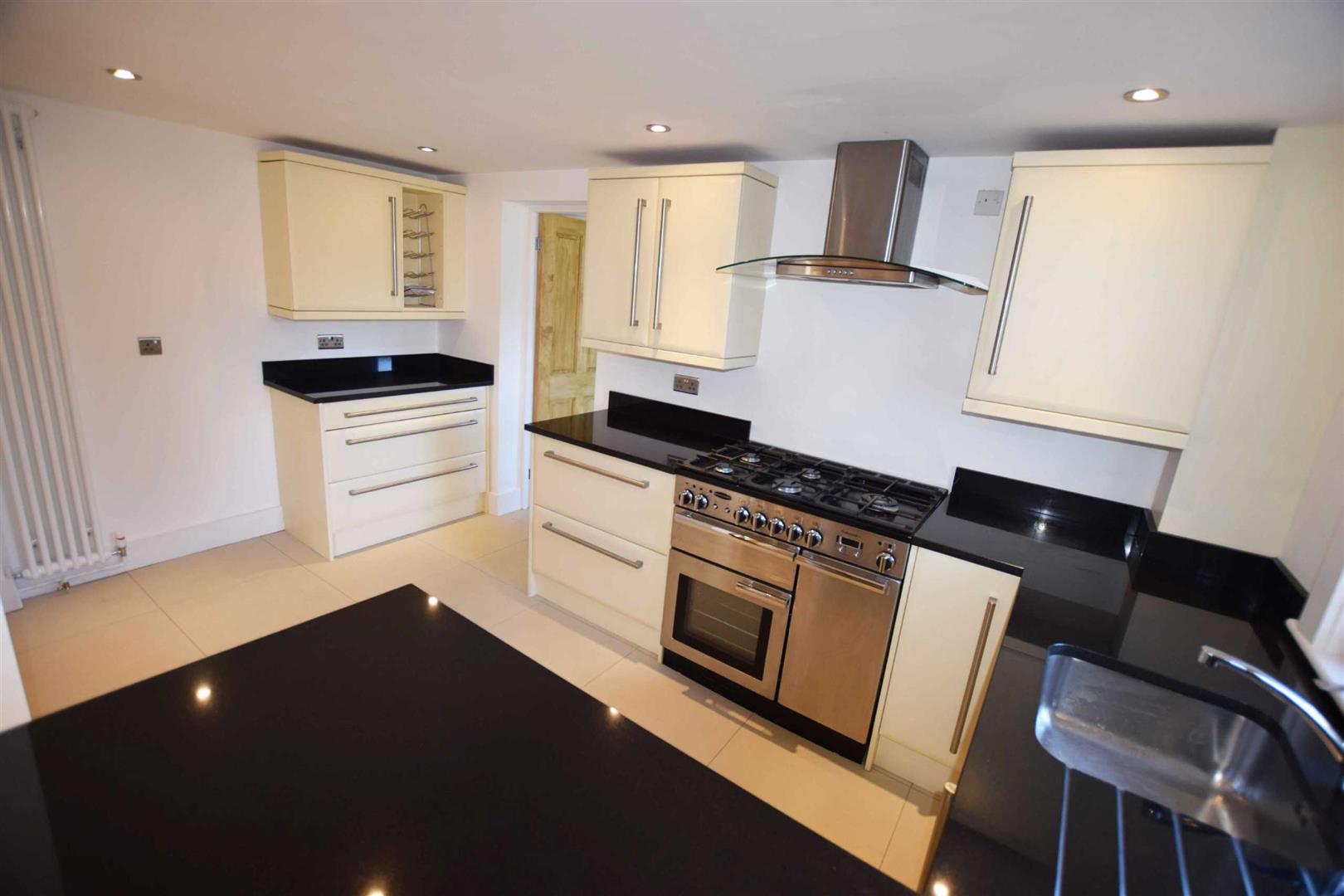 Re-Fitted New Kitchen - 14'10 x 8' - Inset ' Blanco' stainless steel sink unit with granite routed drainer and 'Grohe' mixer tap, black granite work top surfaces and breakfast bar with an excellent range of Italian cream fronted units with 'Blum' soft close hinges, large chrome handles, fitted cupboards, conventional and pan drawers, 'Range Master Professional' stainless steel range oven with a five ringed gas burner, stainless steel cooker, double glazed window to side aspect, column style vertical radiator, inset ceiling spot lights, ceramic tiled floor, built in cupboard housing consumer box, space for dishwasher.
