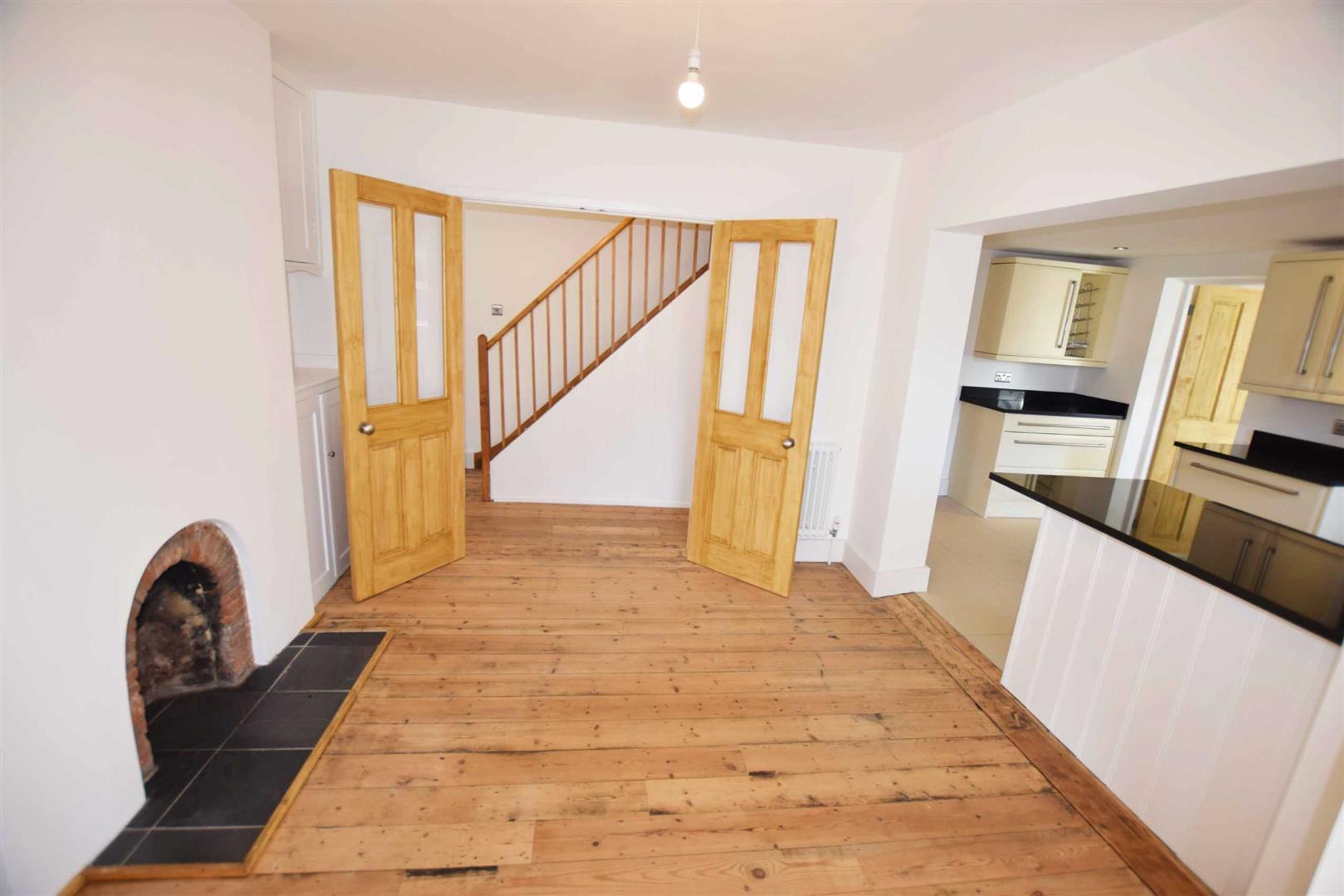 Dining Room - 11'2'' x 9'4'' - Feature fireplace with slate hearth, built in cupboards either side of chimney breast, exposed wooden floorboards, half glazed double doors to hall way and half glazed double doors opening into lounge, high skirting.