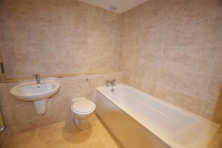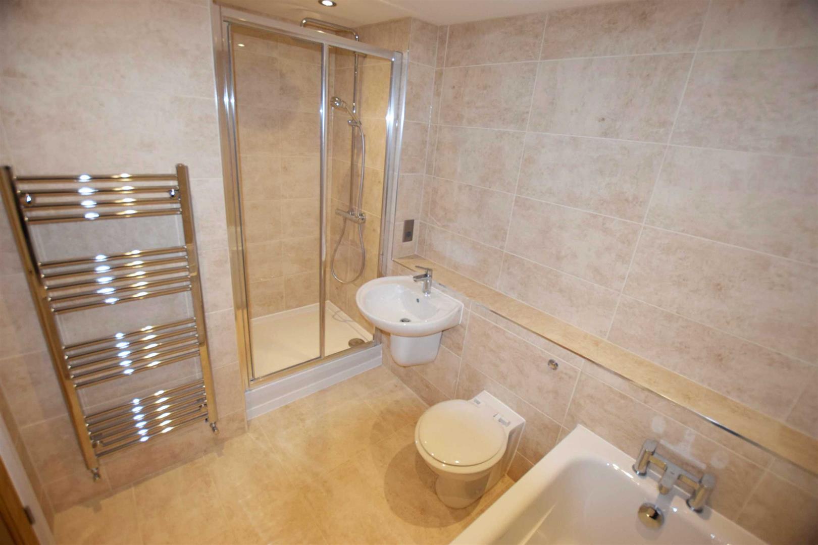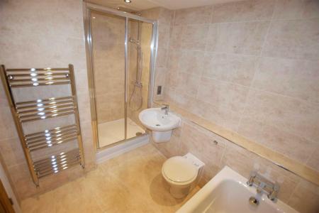 Family Bathroom - Brand new white modern four piece suite comprising of a panelled bath with 'Grohe' mixer tap, low level WC, fitted double sized shower enclosure with an overhead 'Hansgrohe' rainfall shower, separate shower attachment and wall mounted mixer control, chrome ladder style heated towel rail, fully tiled walls, ceramic tiled floor, inset ceiling spot lights, extractor fan, shaver point.