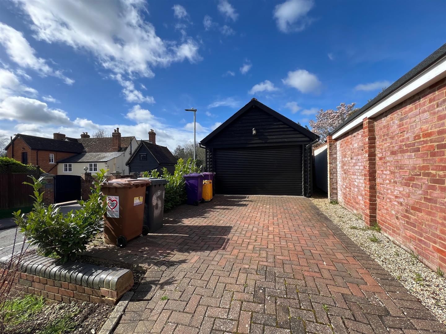 Garage and Parking: A large garage with a pitched roof measuring 13ft 6ins wide and 18ft 3 ins long and 13ft 6ins wide and a double driveway for two cars at the far end of the garden with access off Bury Lane.