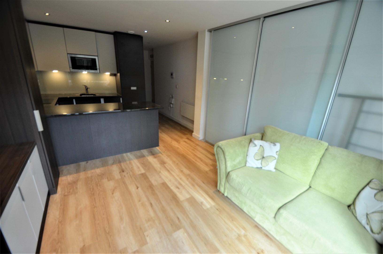 This property offers a spacious living space with sliding glass panels separating the living room from the bedroom as well as an open plan fitted kitchen with integrated appliances including dishwasher, fridge/freezer and oven. There is a separate three-piece modern bathroom.