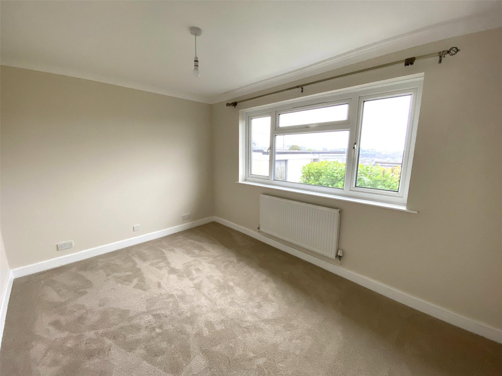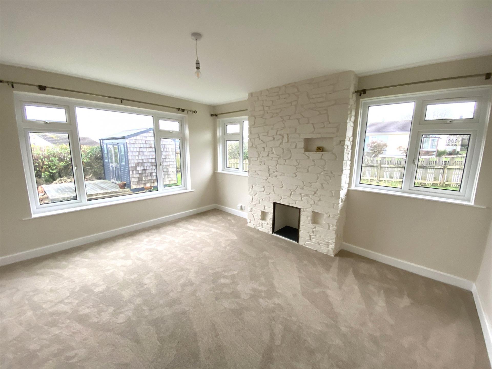 The welcoming entrance hall leads to a bright and generously sized dual aspect lounge, where large windows draw in natural light and provide pleasant elevated views across Bodmin.