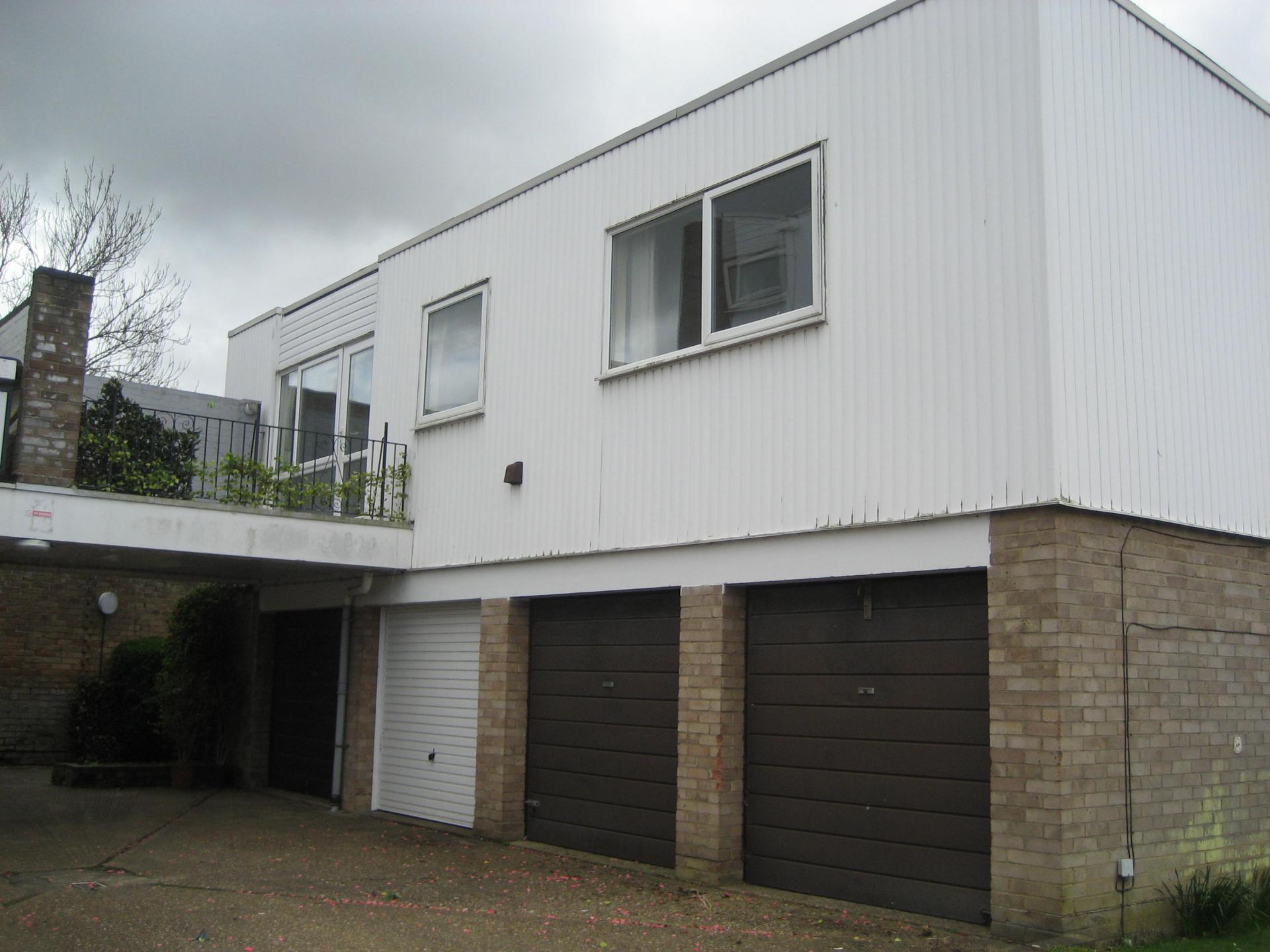 Basic accommodation includes kitchen with free-standing appliances, lounge leading to roof terrace, two bedrooms, bathroom/WC. Door by front door leading to garage before going up to flat.
