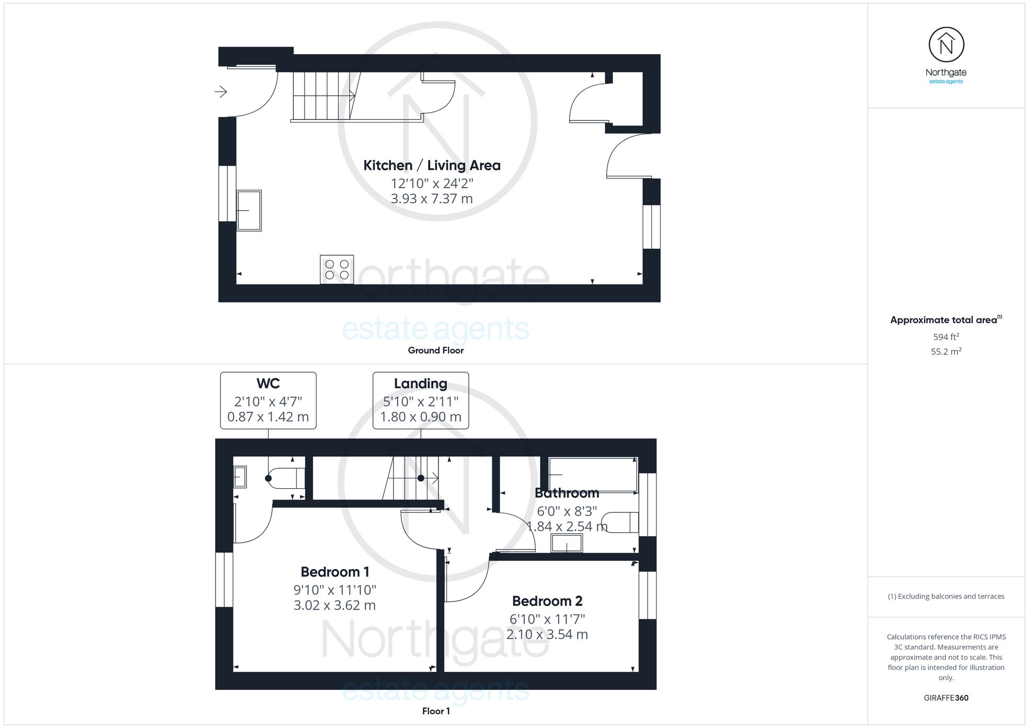 The ground floor offers an open-plan living and dining space alongside a modern fitted kitchen. Upstairs, there are two bedrooms, including a main bedroom with an en-suite WC, and a separate bathroom with contemporary fittings.