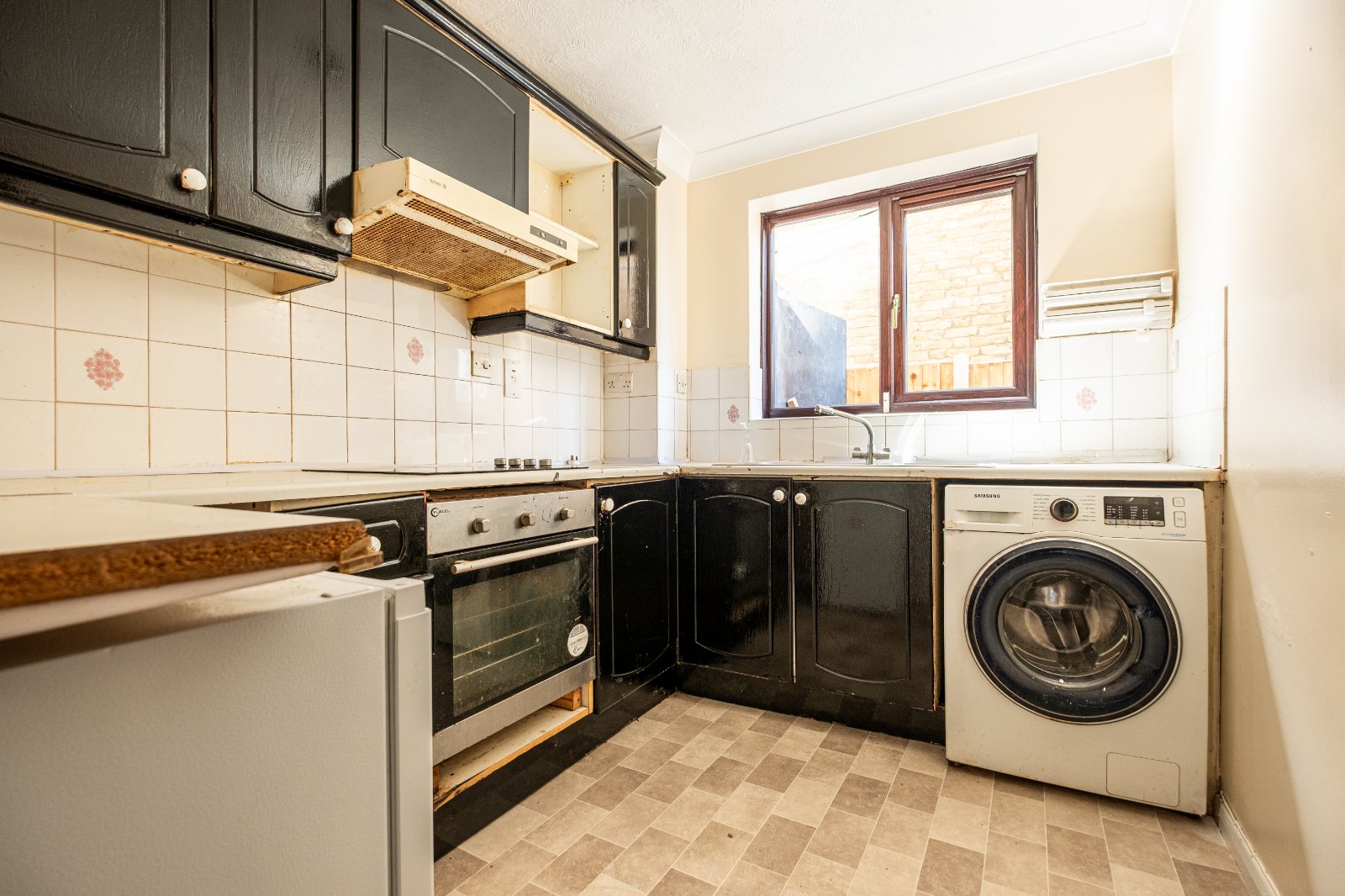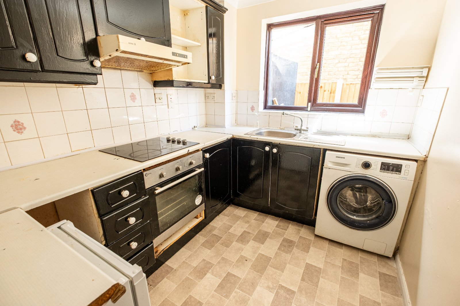 Kitchen 8'6" x 7'1" (2.6m x 2.16m). Double glazed window to side. Part tiled walls. Sink and drainer unit with mixer taps. Oven and hob with extractor fan over. Fridge. Washing machine. Two double plug points. Wall and base units with work surfaces over. Vinyl flooring. Coved ceiling with ceiling light.