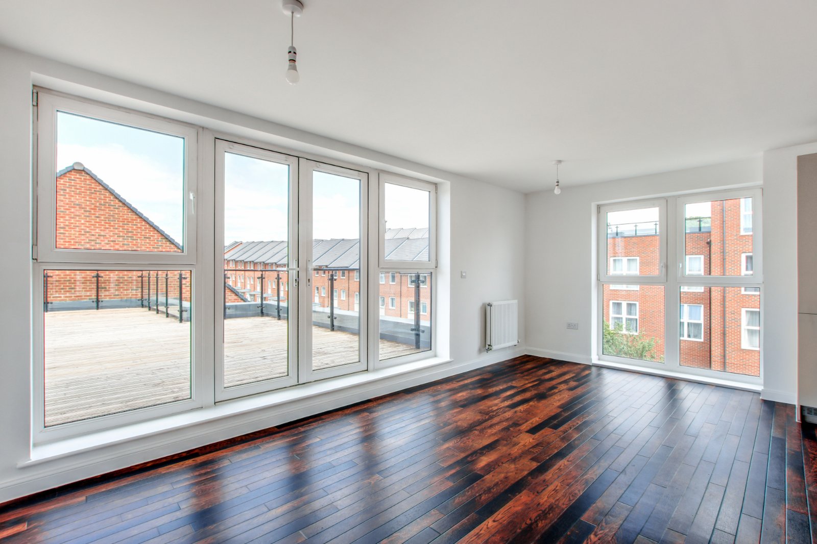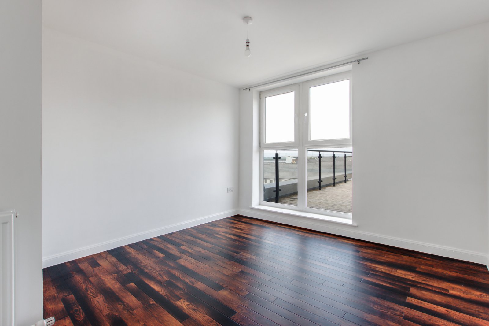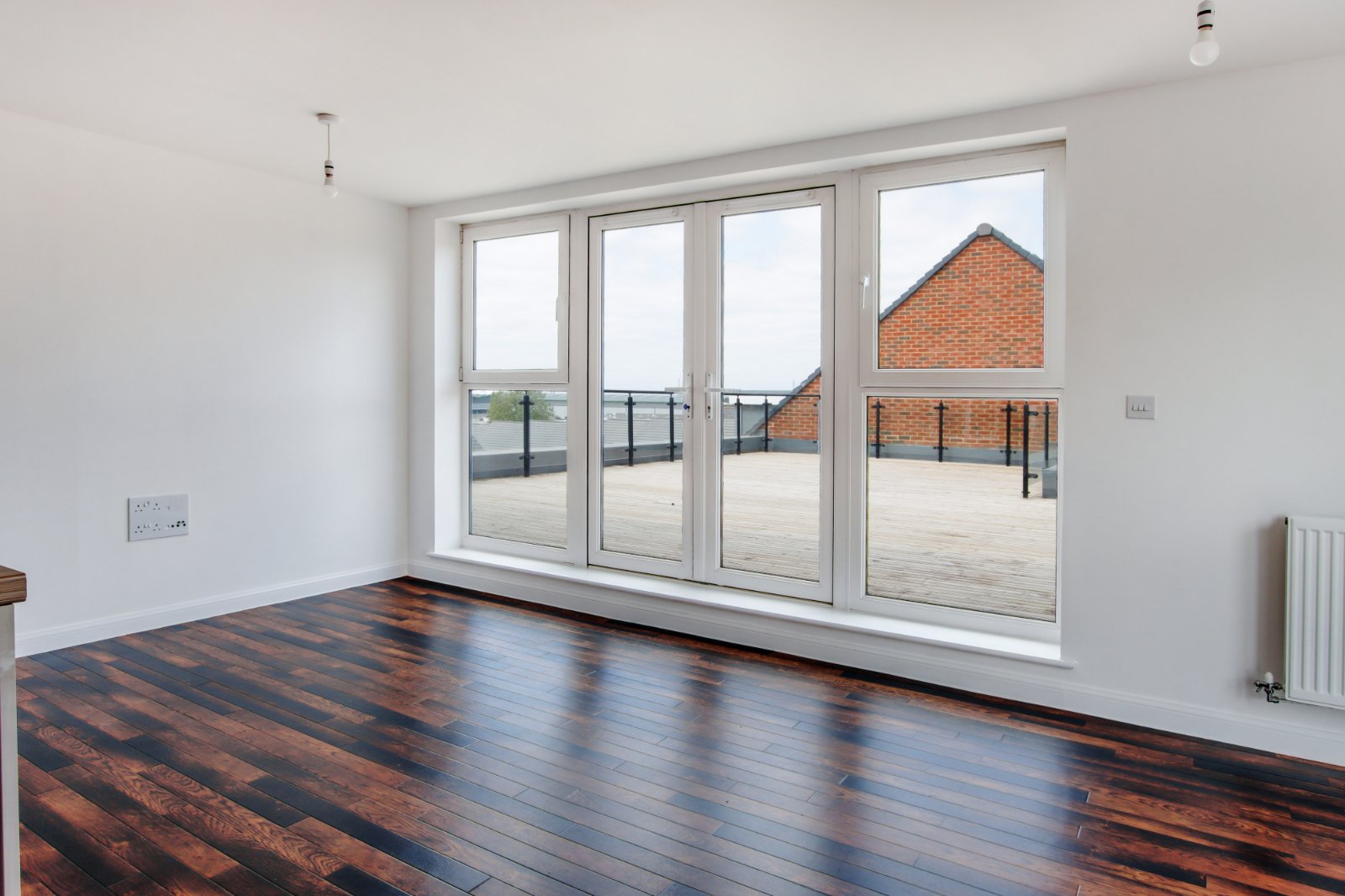Living Room Area - Full length double glazed window to side. Double glazed full length French doors leading to roof terrace with double glazed windows to either side. Radiator. Wood effect flooring. TV point.