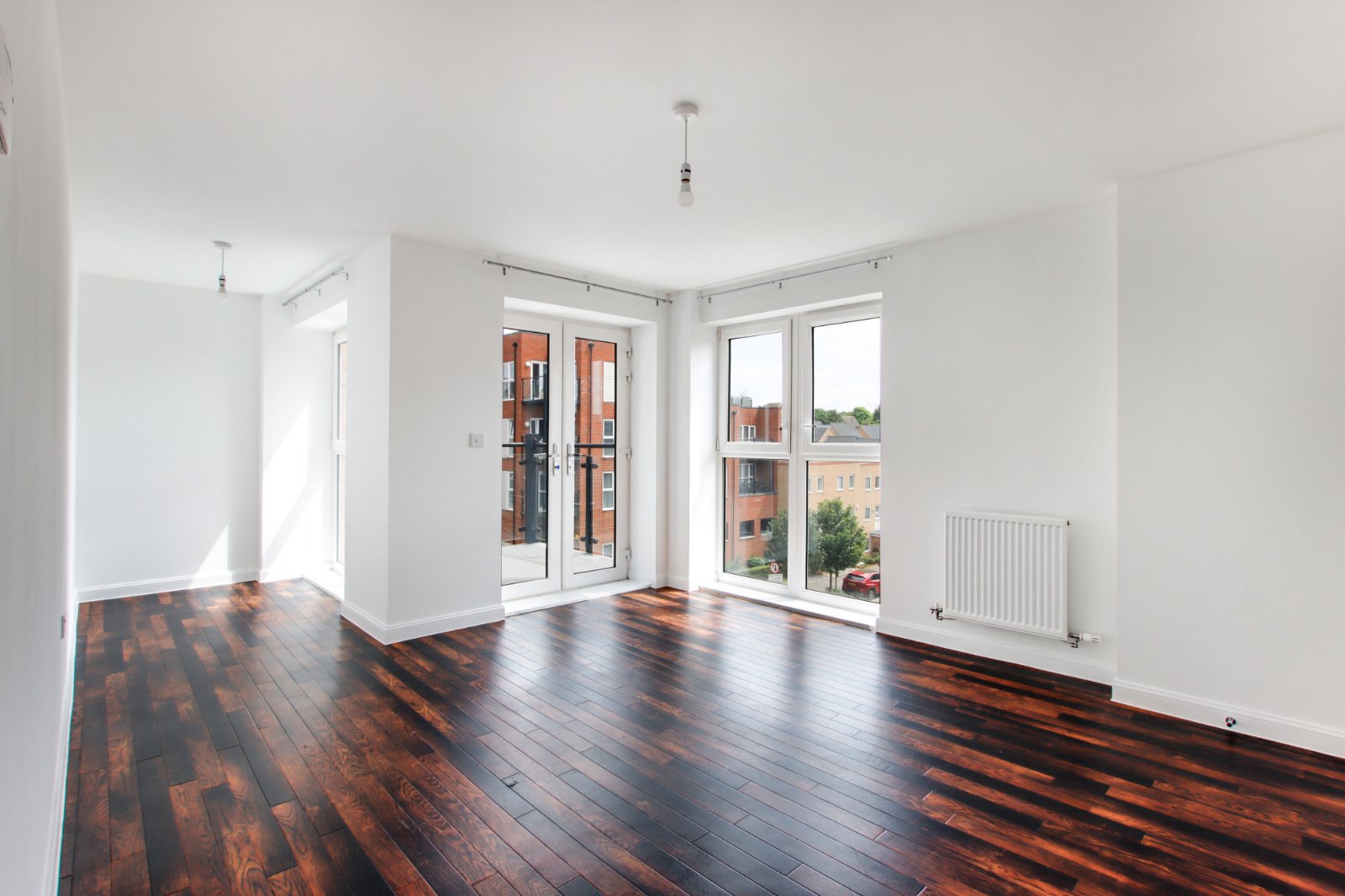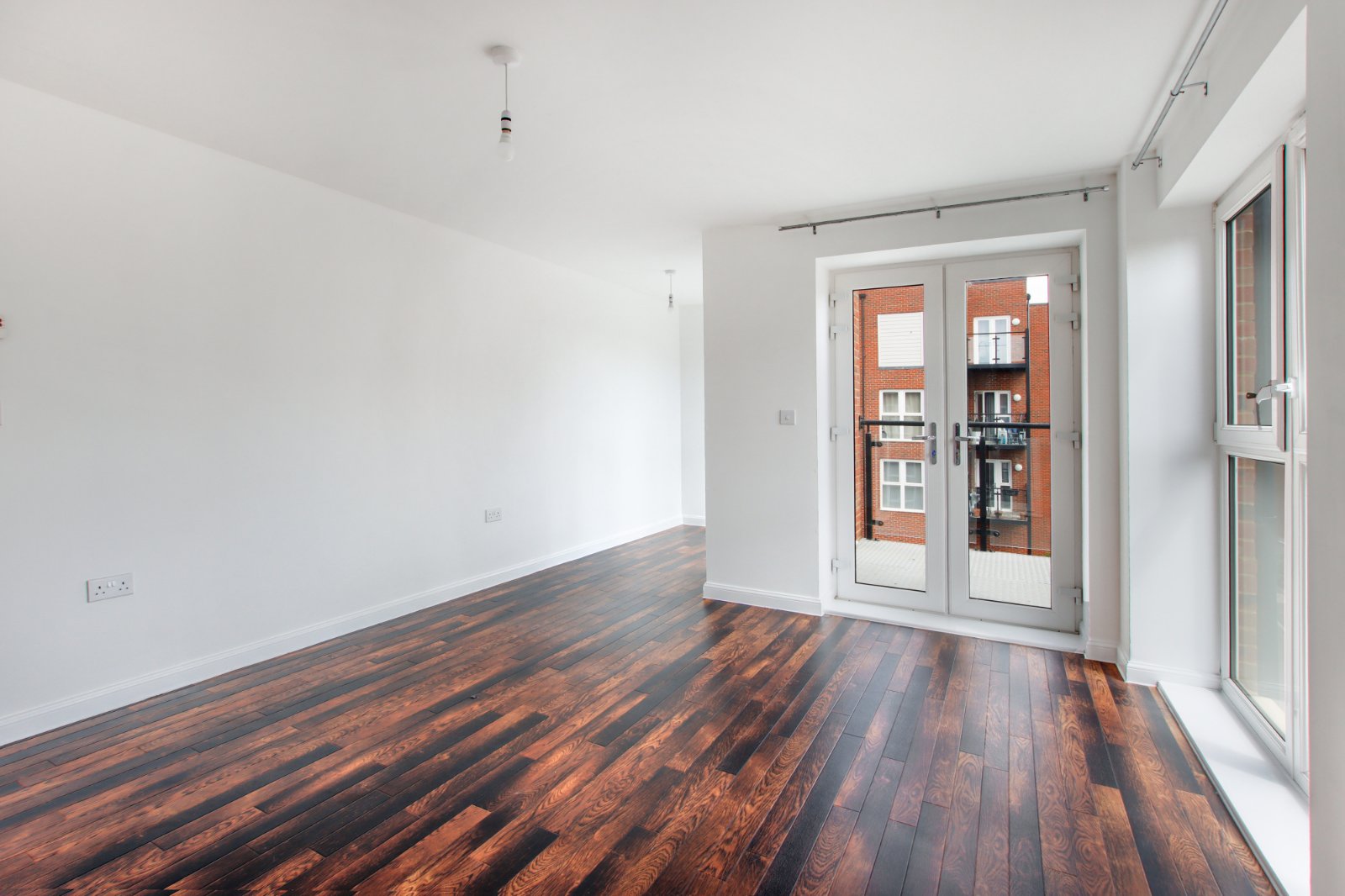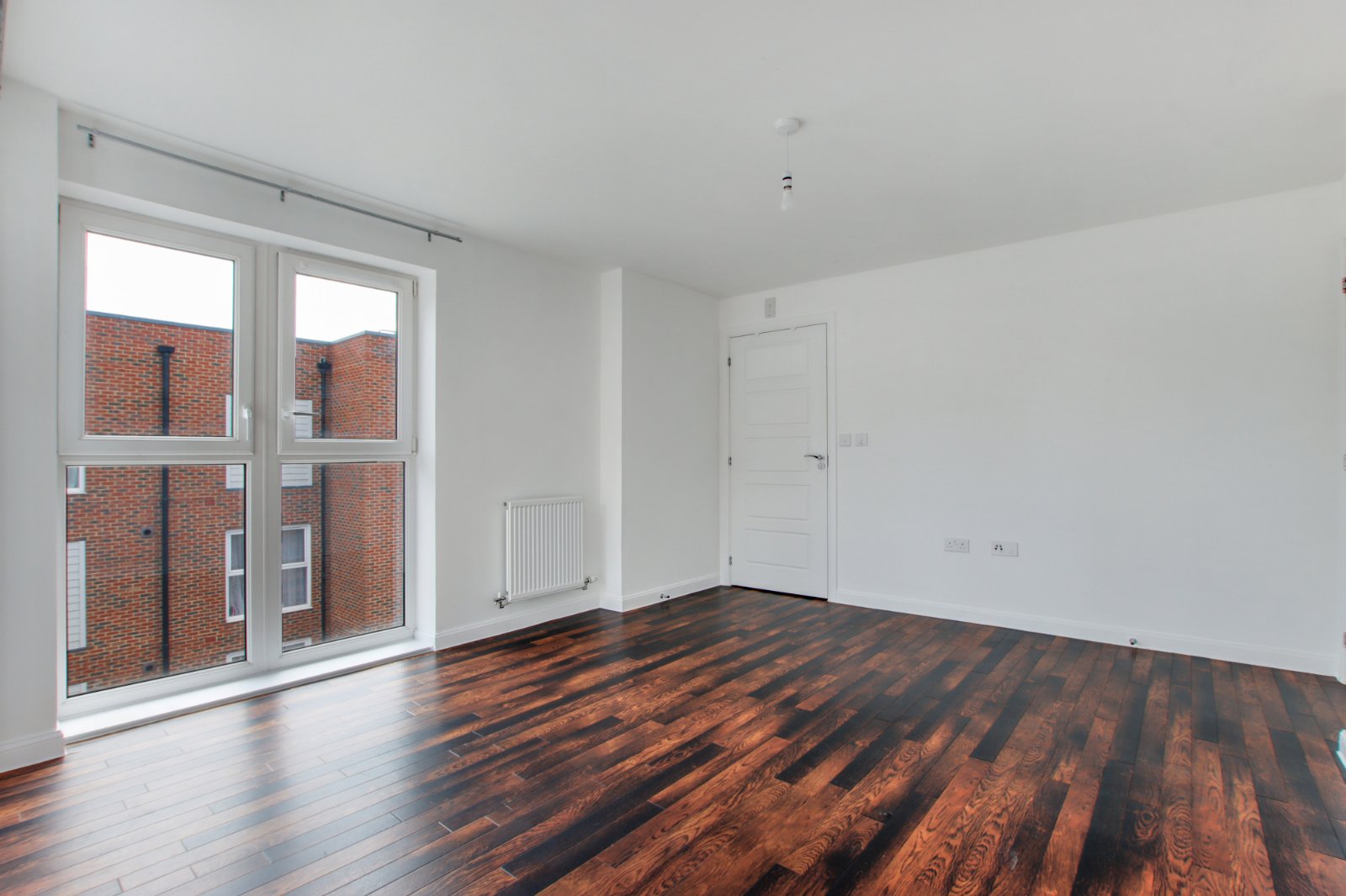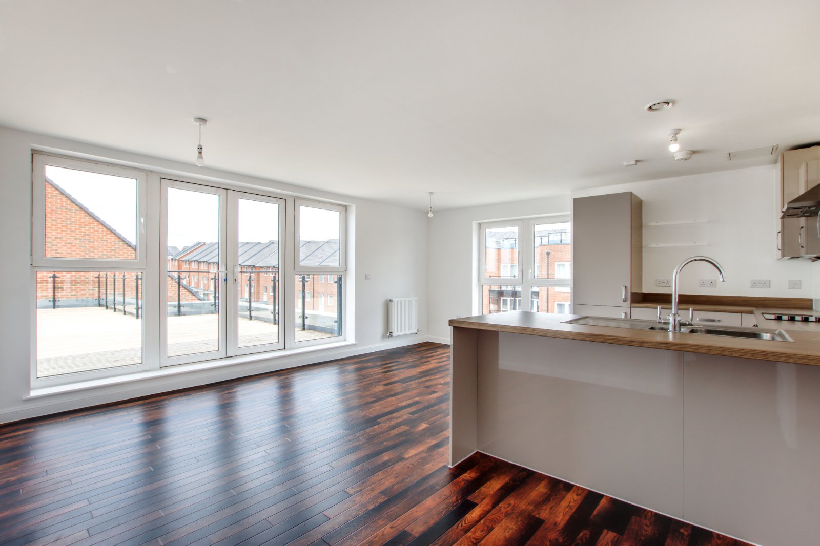 Living Room Area - Full length double glazed window to side. Double glazed full length French doors leading to roof terrace with double glazed windows to either side. Radiator. Wood effect flooring. TV point.