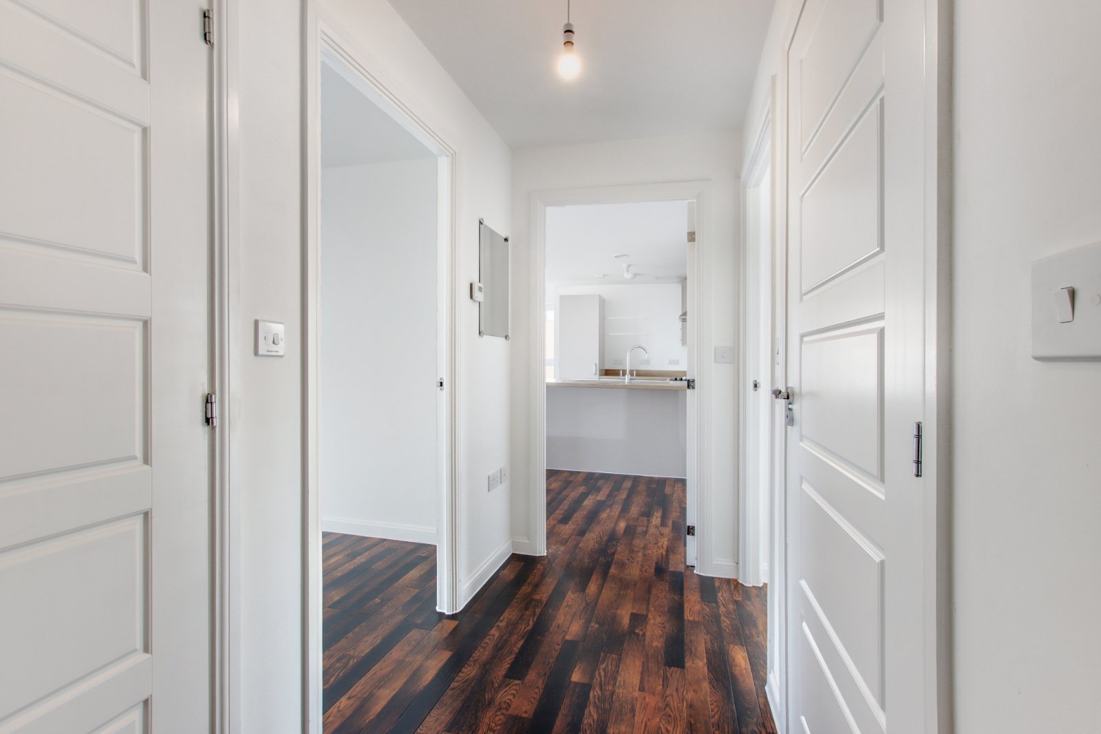Entrance Hall Door leading to hallway. Wood effect flooring. Plain ceiling. Radiator. Entry phone. Storage cupboard housing electrics.