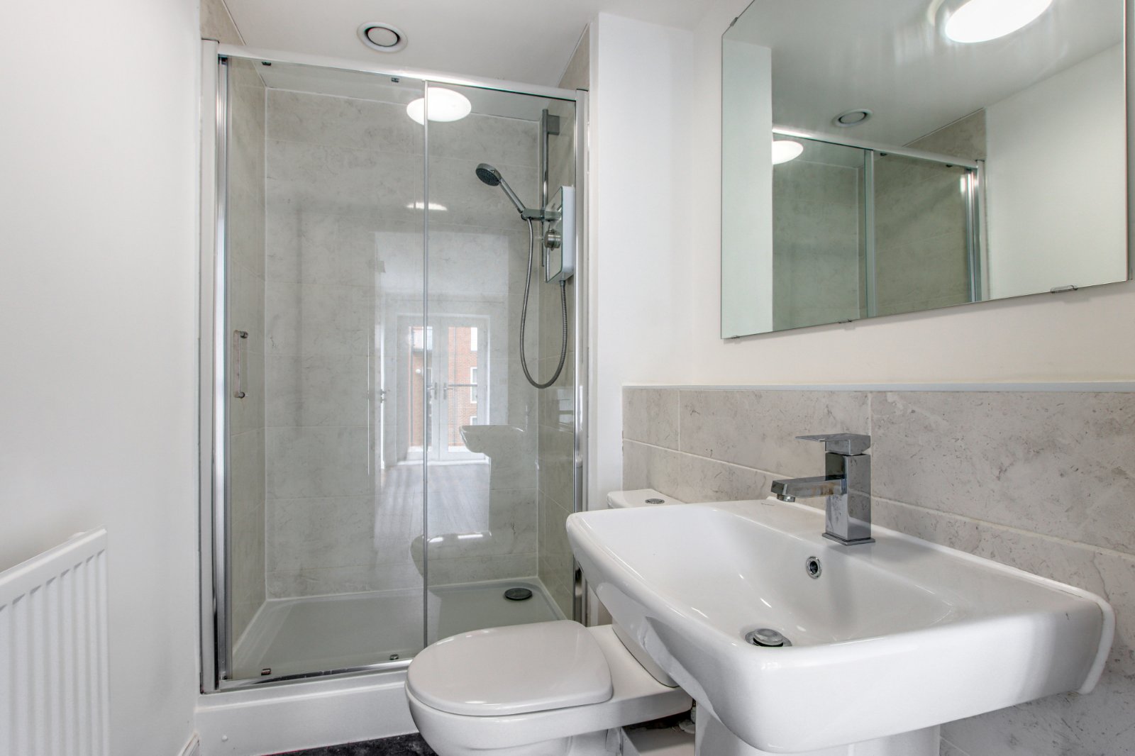 En-Suite Shower Room Vinyl flooring. Plain ceiling. Extractor fan. Radiator. Shower cubicle. Pedestal wash hand basin. Close coupled W.C. Local tiling to walls. Wall mirror.