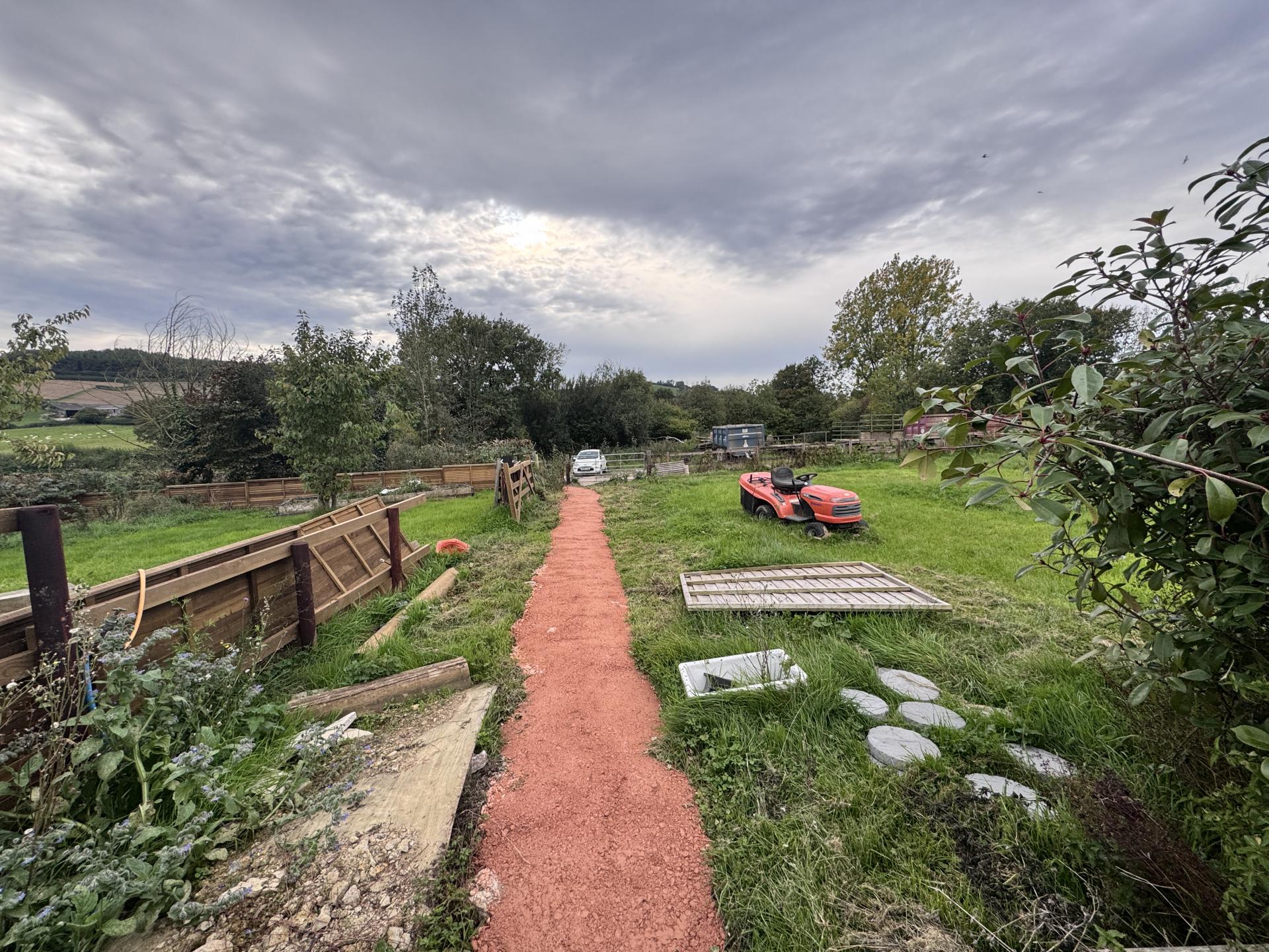 There is parking access from below the Farm itself, where there is parking for one car. There is a stepping stone path with leads from the parking to a gate, giving access to the private garden. The garden is fenced and there are steps up to a patio adjacent to the house.