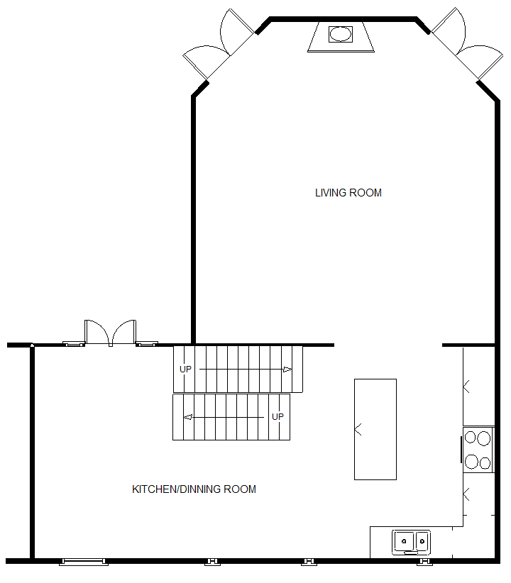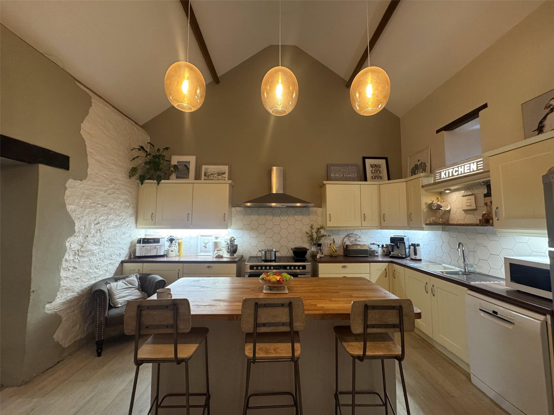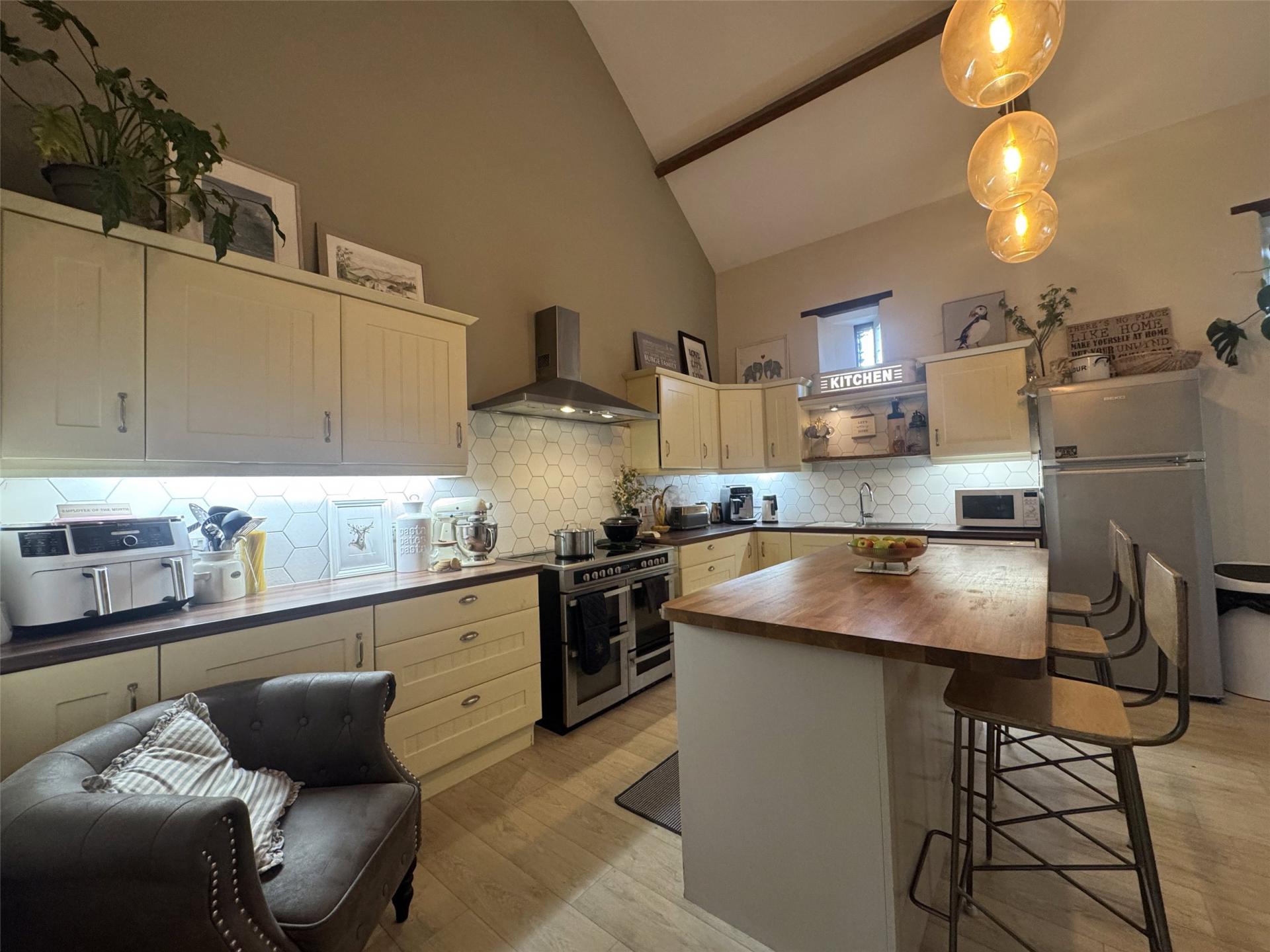 - Open-plan kitchen/dining room with electric range and breakfast bar.