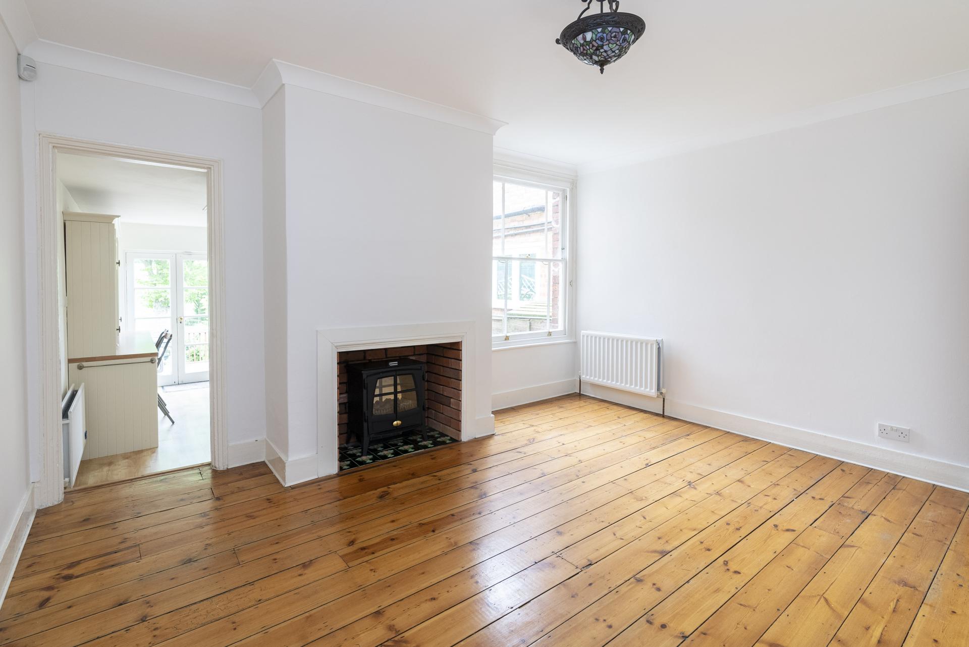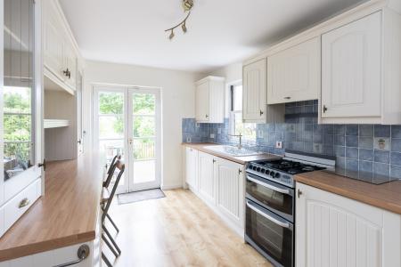 The property features wood flooring throughout the ground floor, from the entrance hall leading through to bright and airy sitting room with fireplace and gas fire, on to the dining room with electric effect log burner and large under stairs cupboard with steps down in to the spacious fully fitted kitchen with ample work surface space, including integrated gas hob, double oven and grill, washer/drier and fridge freezer.