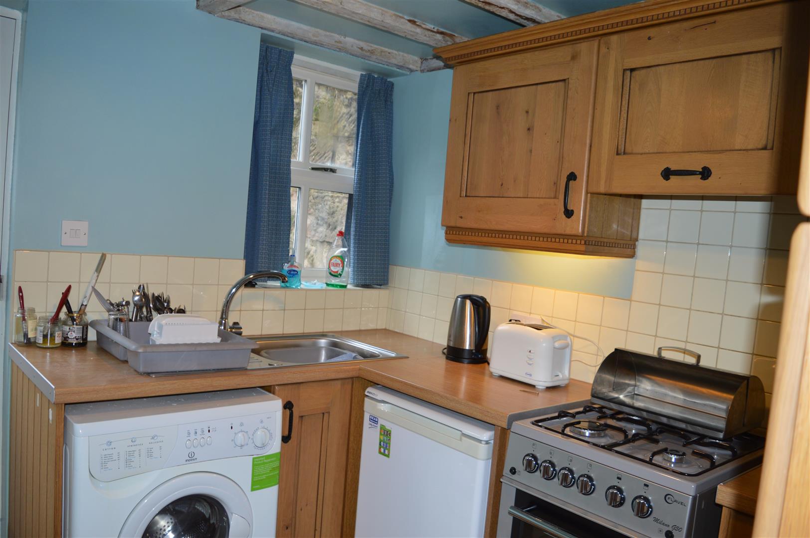 Kitchen - Kitchen, with ceramic tiled flooring and beamed ceiling. Newly installed gas cooker and washer/dryer. Under counter fridge. Radiator. Oak floor and wall kitchen units. Door through to the courtyard style garden.