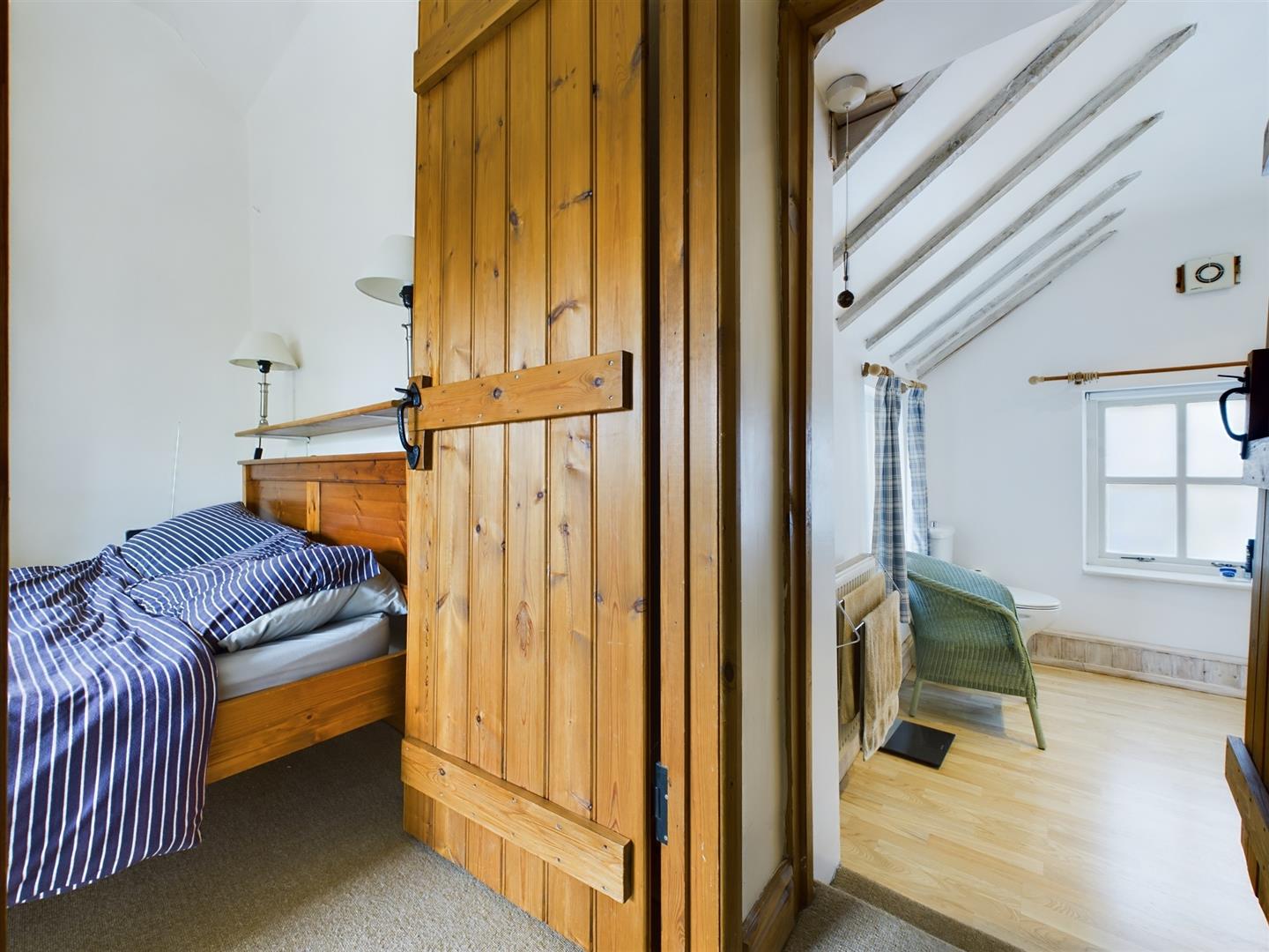 Bedroom - Spacious double Bedroom with a beamed ceiling. Fully carpeted. Double bed and mattress and chest of drawers. Integrated wardrobe. Window, with attractive roman blind, overlooking the front of the property