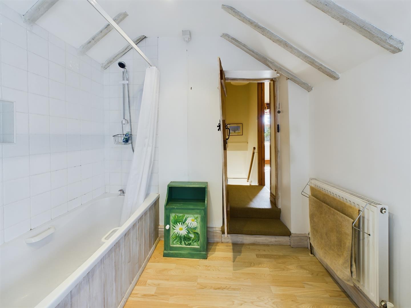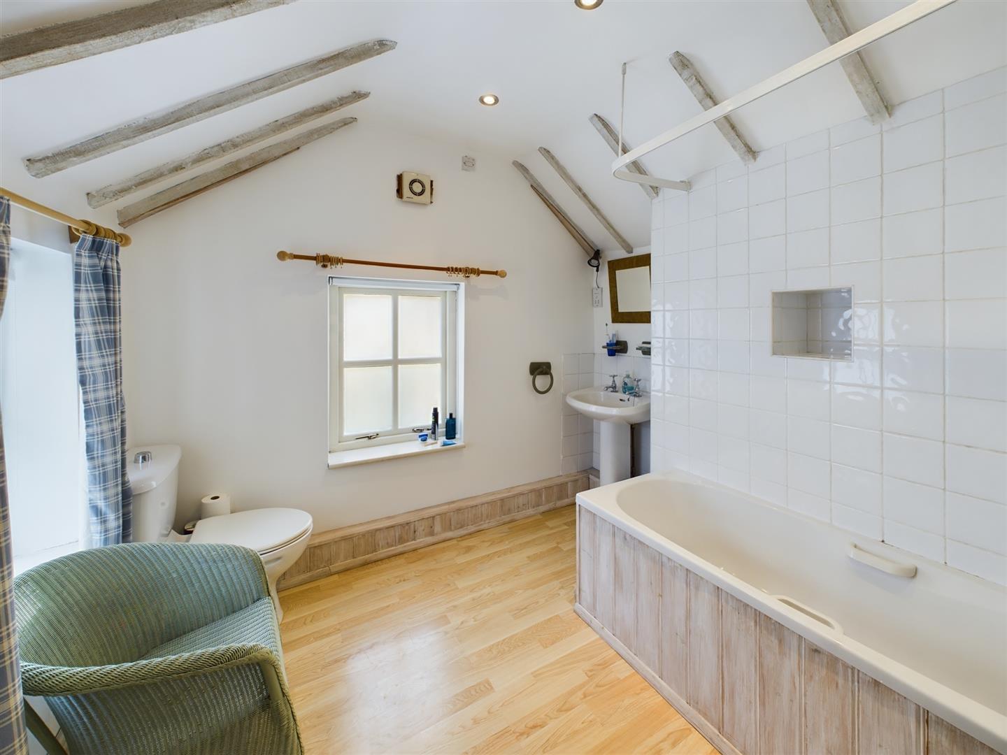 Bathroom - Family bathroom, comprising bath with shower over, pedestal wash hand basin and low flush wc. Laminate flooring and window overlooking the rear courtyard