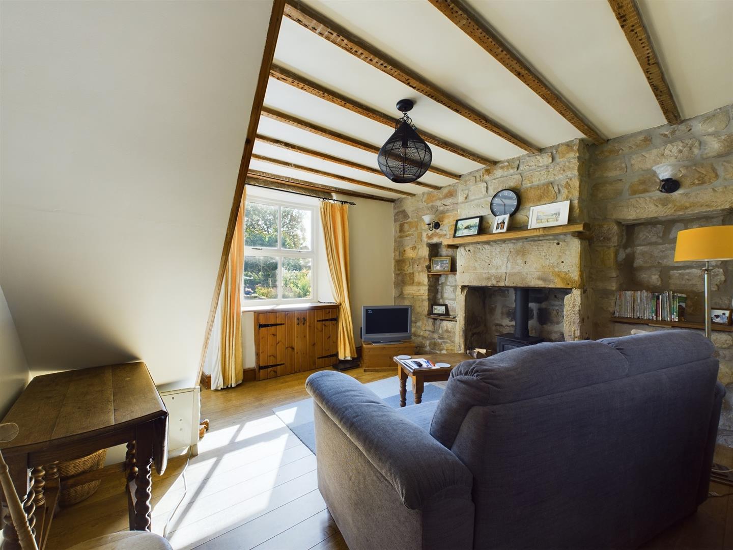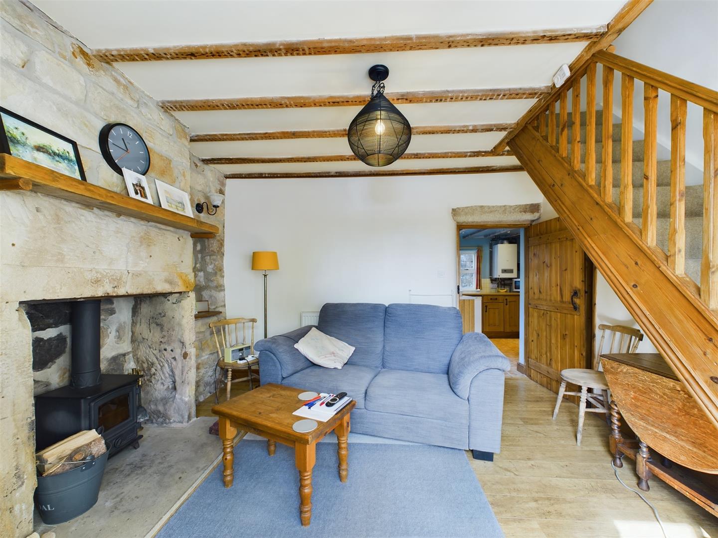 Lounge - The Lounge overlooks the front elevation. With wood-effect laminate flooring, beamed ceilings and original stone fireplace with cast iron wood burning stove, GCH radiator. The room has two arm chairs, coffee table and lamp. The tv can remain but is not included in the tenancy. Through to