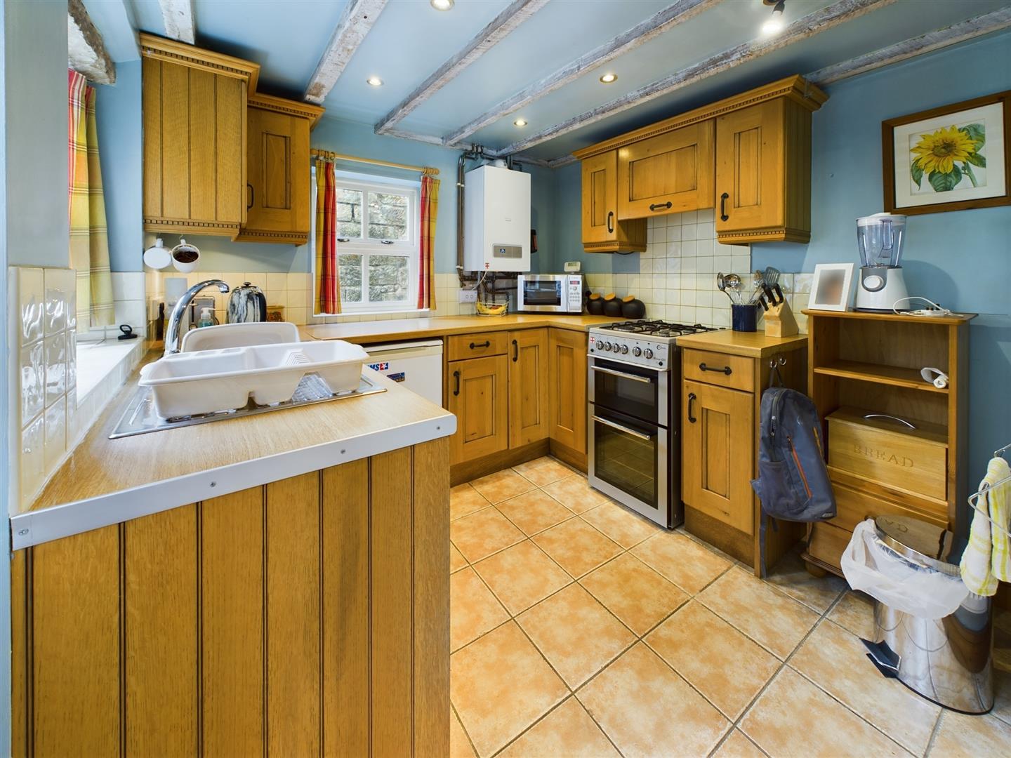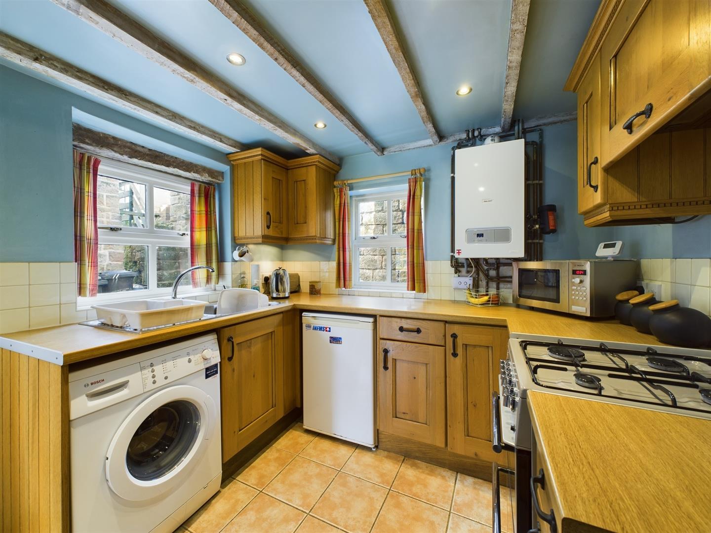 Kitchen - Kitchen, with ceramic tiled flooring and beamed ceiling. Four burner gas cooker and washer. Under-counter fridge. Radiator. Oak floor and wall units. Door out into the courtyard style garden.