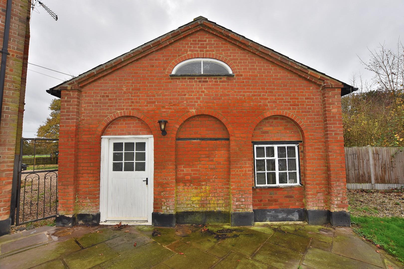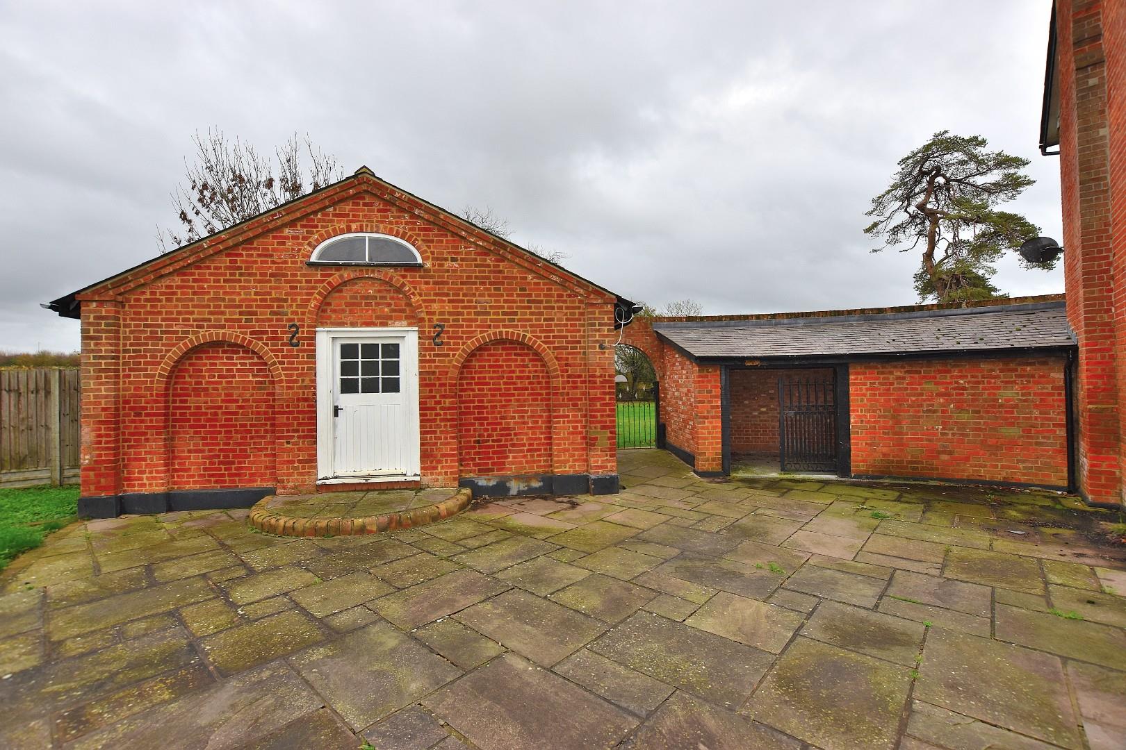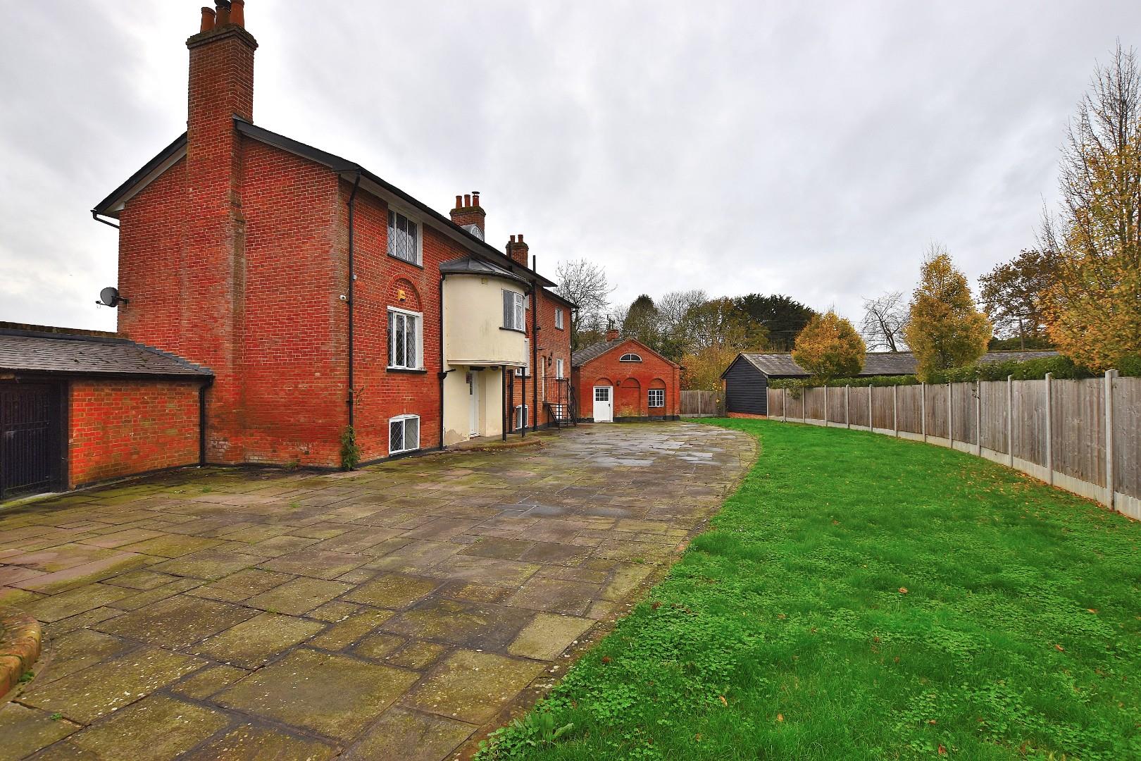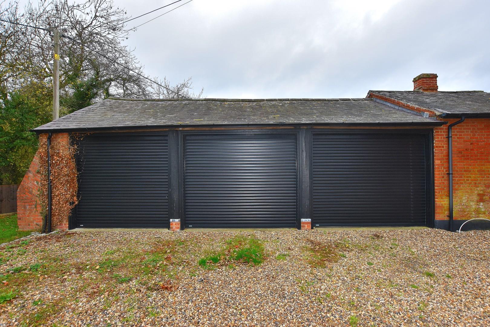 Exterior - Enclosed rear garden with two outbuildings, triple garage and parking for multiple vehicles.