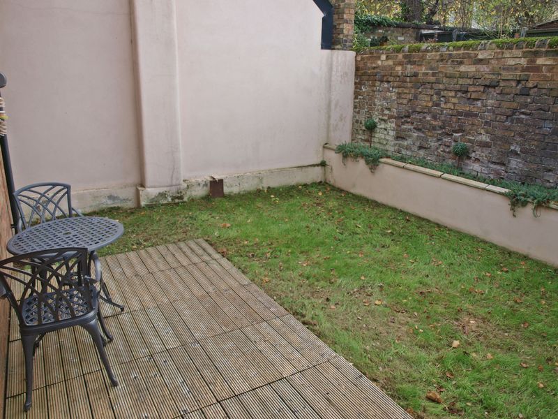 Secluded and laid to lawn with a decked patio area, enclosed by fencing and brick wall, gated access to side.
