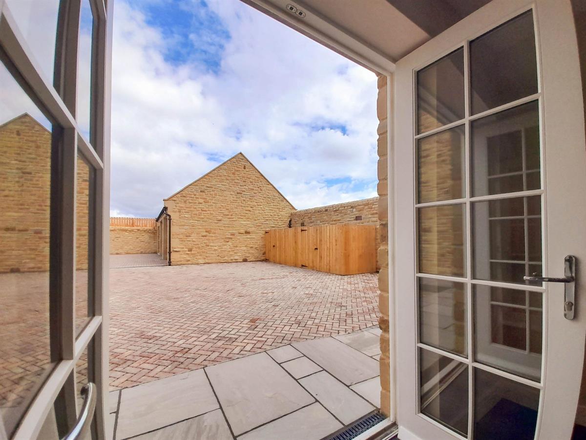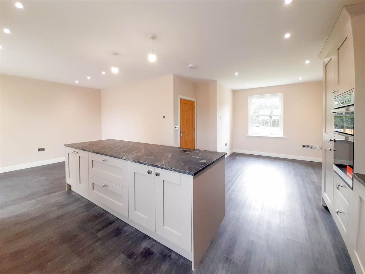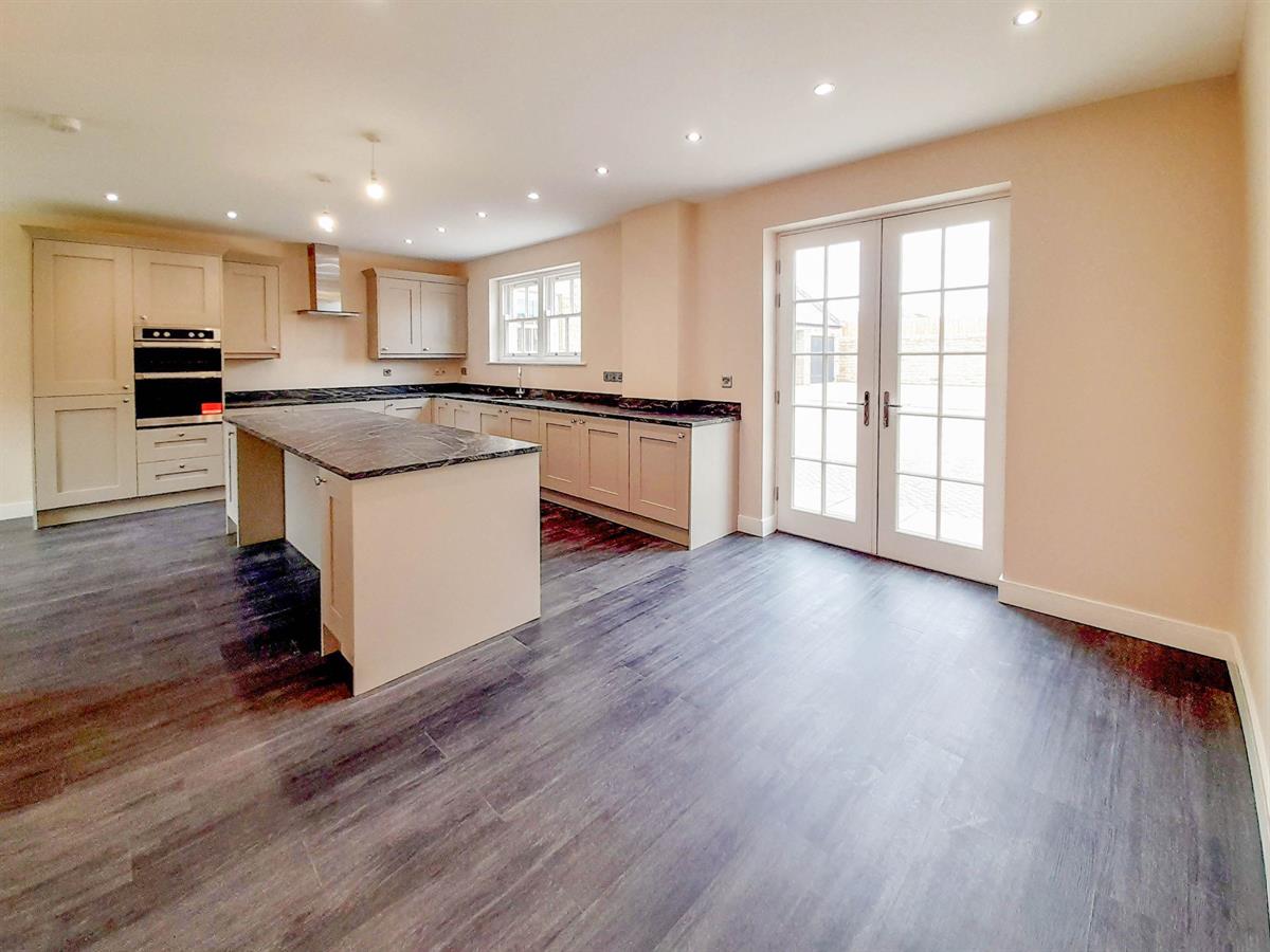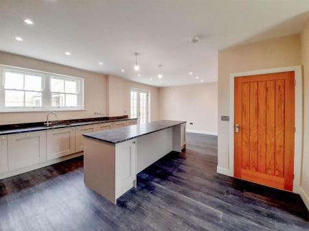 The open plan kitchen/diner is to the left of the entrance hallway and is well proportioned with flexible living space, dual aspect windows and French doors create a large bright entertaining area. The contemporary kitchen has a range of solid wood base and wall mounted units, painted in pale grey which are topped with Quartz marble effect worktops. Integral appliances include a Hotpoint dishwasher, washing machine, tumble dryer, fridge/freezer, induction hob, oven and extractor fan. The central island provides a breakfast bar, ideal for informal dining. The kitchen also provides access to the courtyard via French doors.