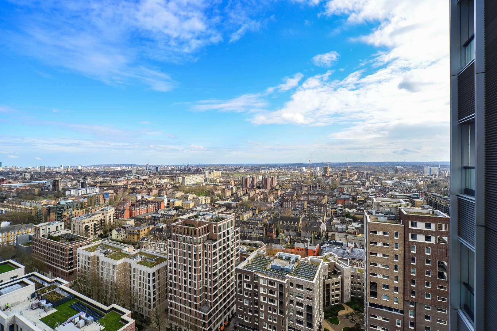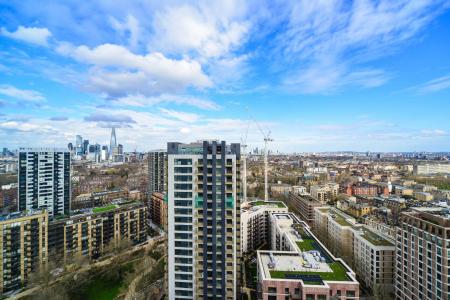 A smart, 24th floor one bedroom apartment within Hurlock Heights in Elephant Park, offering large living space (over £650 sq. ft.) and fantastic views towards the city. The apartment is presented in excellent condition, with an integrated kitchen, light and spacious reception room and a private covered balcony to enjoy the fabulous views. The bedroom has built in cupboards and the bathroom is contemporary.