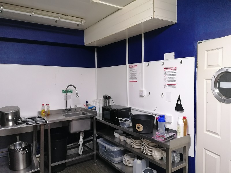 Large kitchen suitable for food prep and plumbed for dishwasher opening to rear storage area