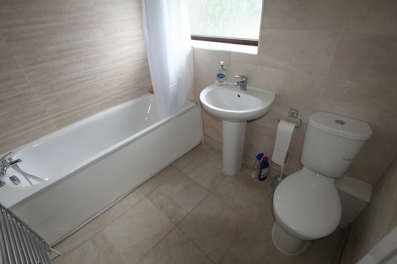 Double glazed window to rear and modern fitted bathroom with low level WC, pedestal wash basin and bath with shower over.