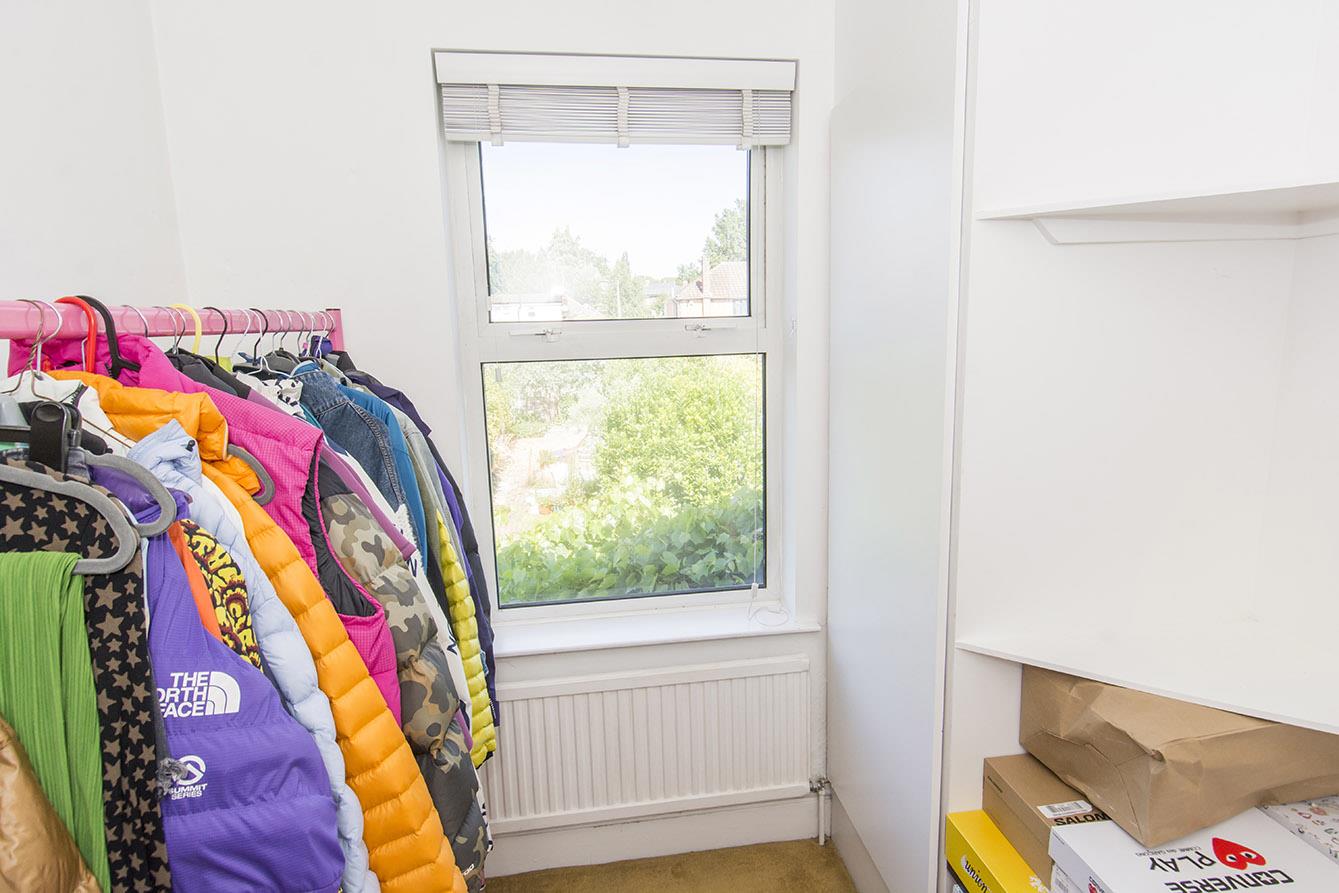 Bedroom Three/ Dressing Room - 1.02m x 1.57m (3'4" x 5'2") - A single bedroom with a window to the rear aspect which is fitted with wooden blinds. There are fitted cupboards with shelving that houses the Worcester Bosch gas central heating boiler.