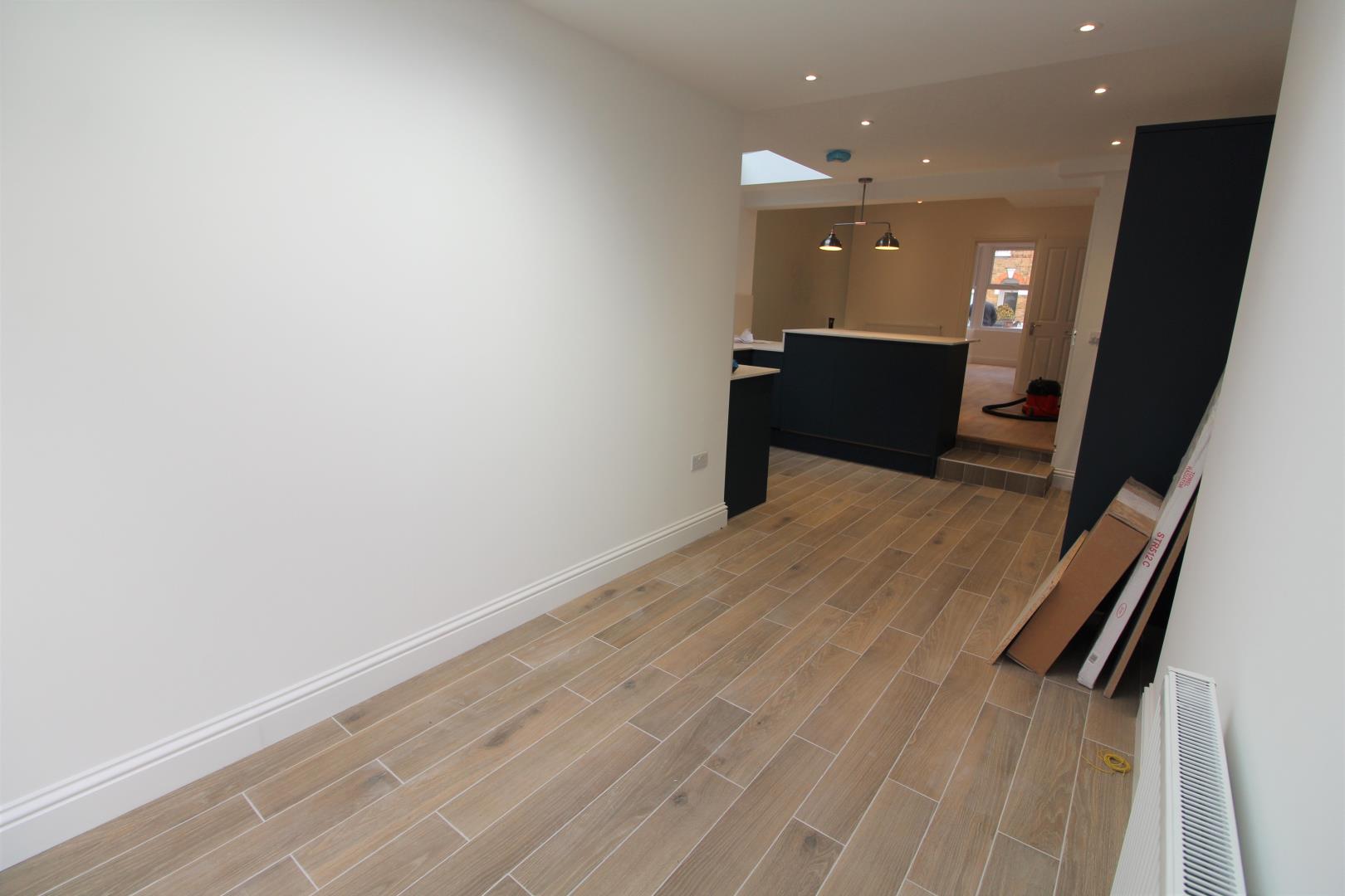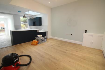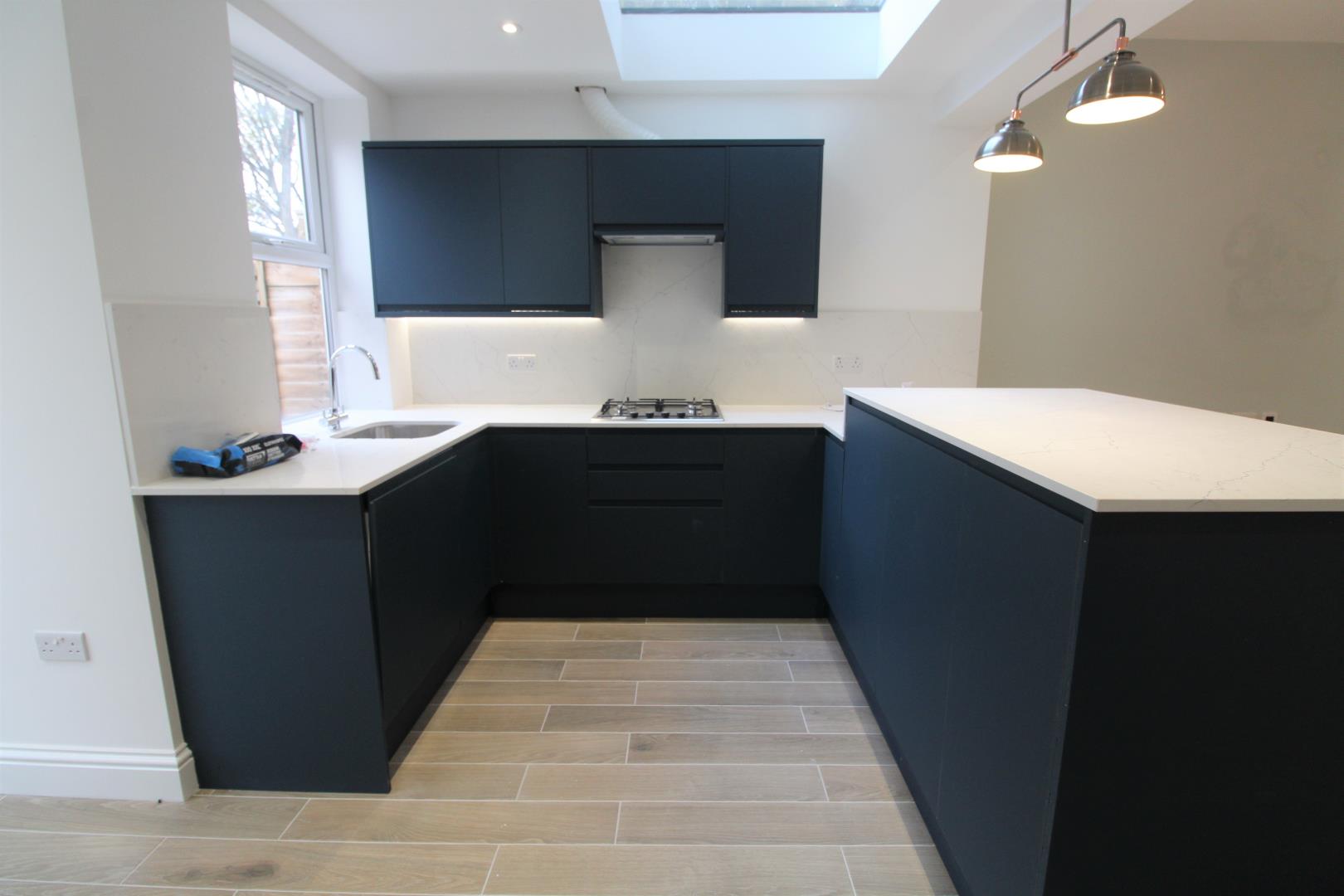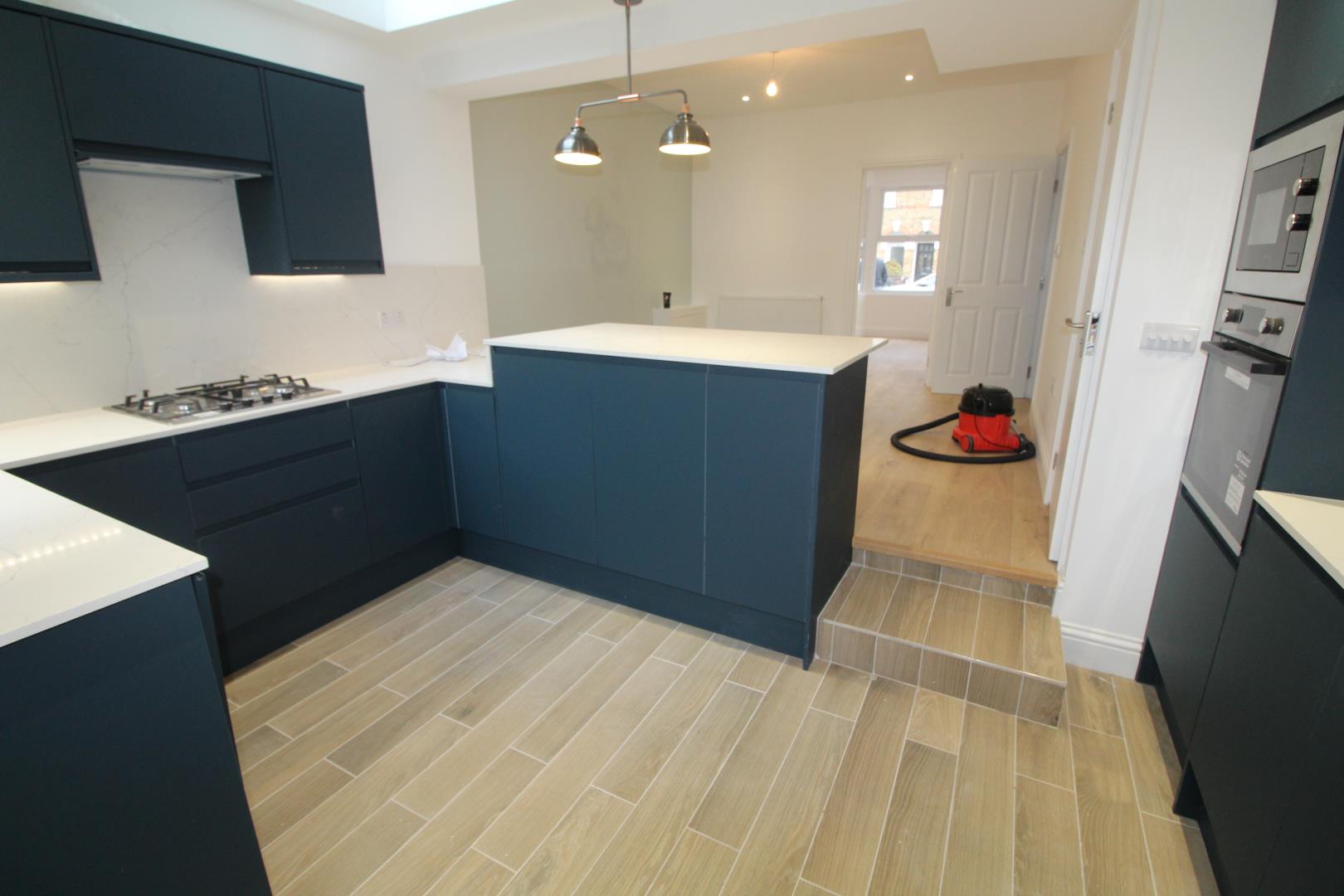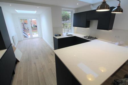 The ground floor offers a bright front reception room, ideal as a living space, followed by a second reception room which provides additional living or dining space and leads through to a modern fitted kitchen. The kitchen benefits from integrated appliances and a skylight, allowing plenty of natural light into the room. The ground floor also features a convenient guest W.C. and provides access to a good-sized private rear garden.