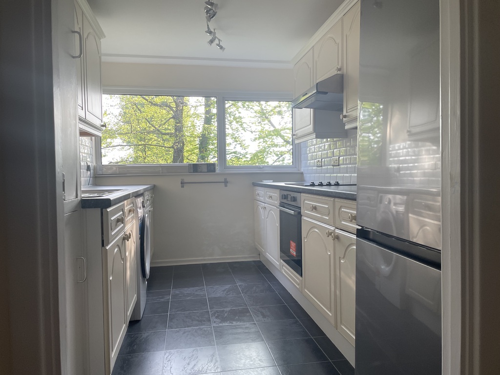 Range of fitted wall and base units, double glazed window, new built in electric oven, new electric hob, and new extractor above, new freestanding fridge/freezer, new freestanding washing machine, tiled flooring.