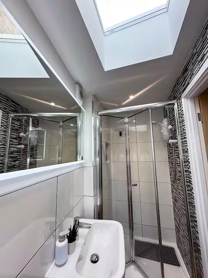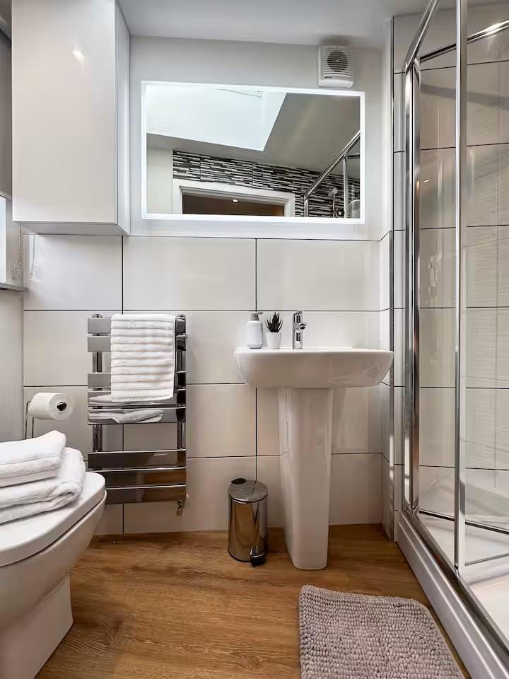The bedroom, with a king size bed is tastefully decorated, complete with built-in storage and a skylight enhancing the sense of space and light. The property is further complemented by a modern shower room with high-quality fittings and a clean, contemporary finish.