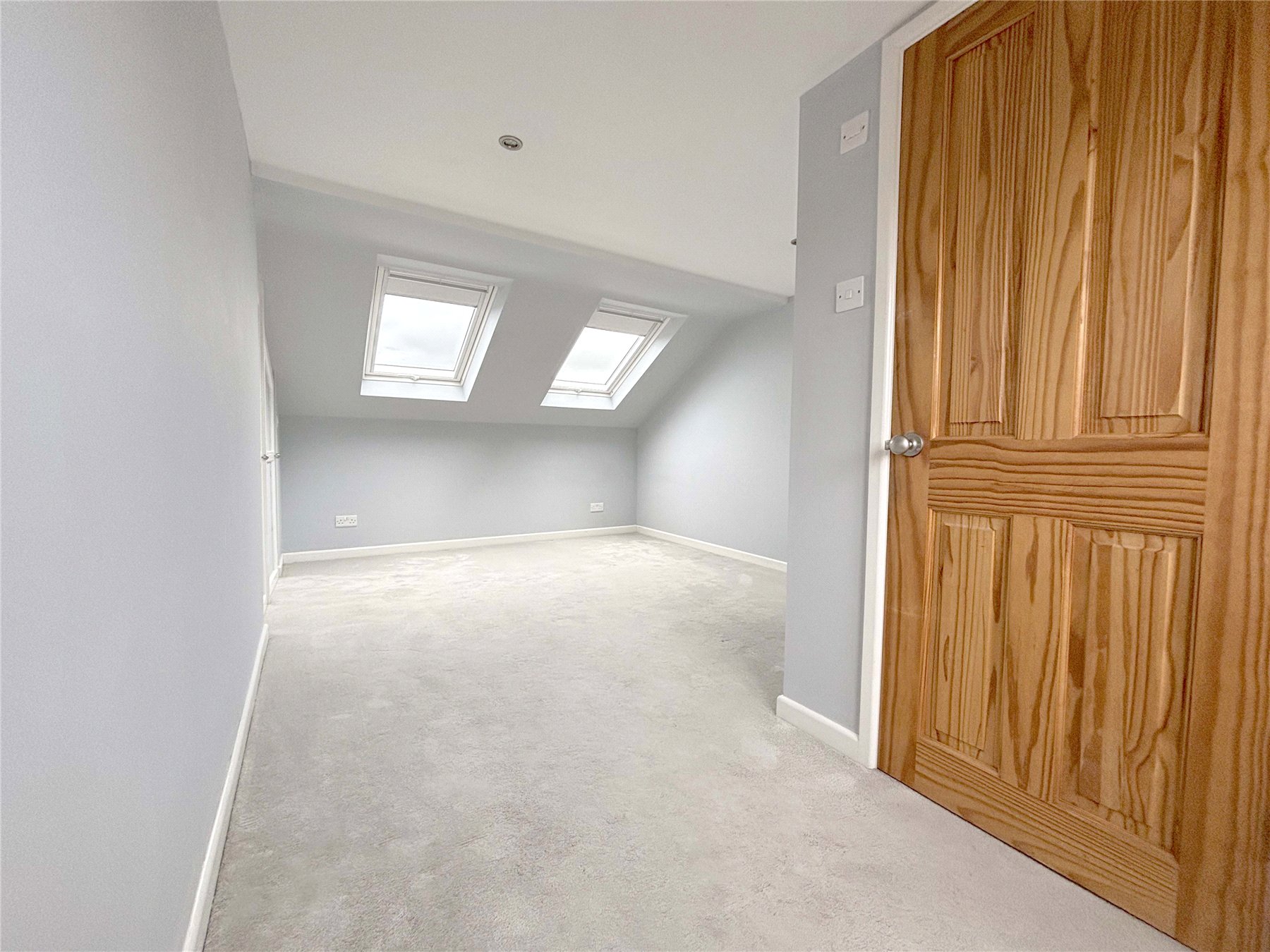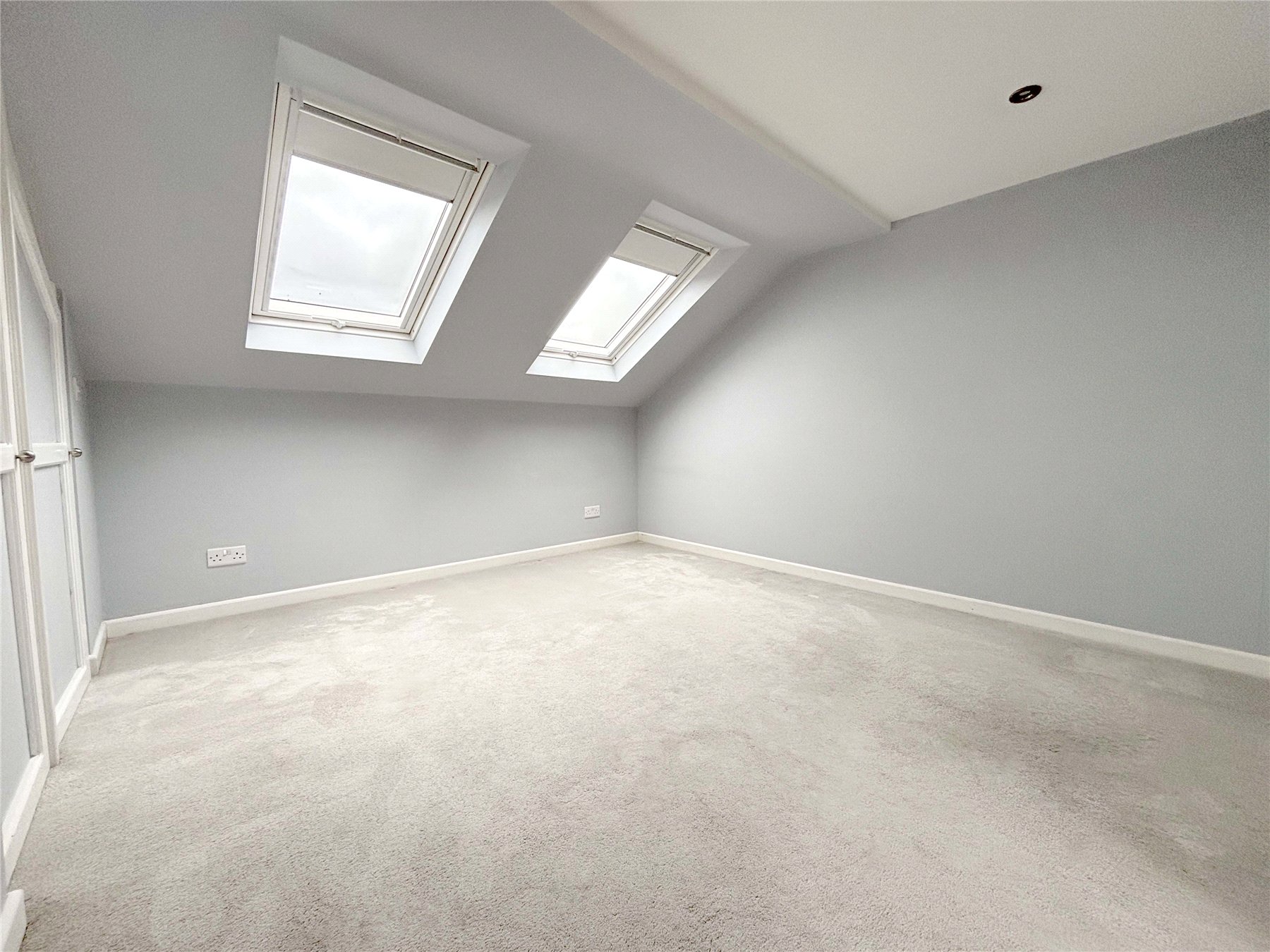 MAIN BEDROOM 17'6" x 10'4" (5.33m x 3.15m). A double aspect room. Two Velux windows to the front with far reaching views and uPVC double glazed window to rear. Built-in wardrobes and access to remaining eaves storage space. Door to