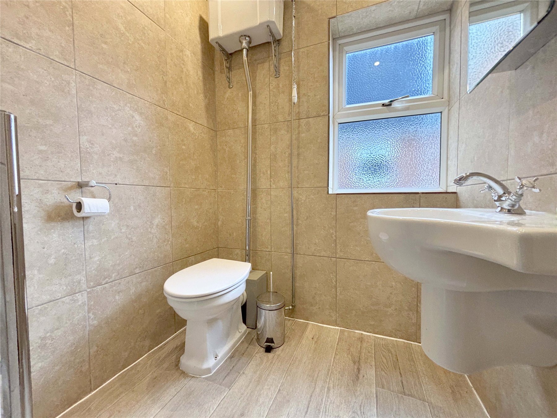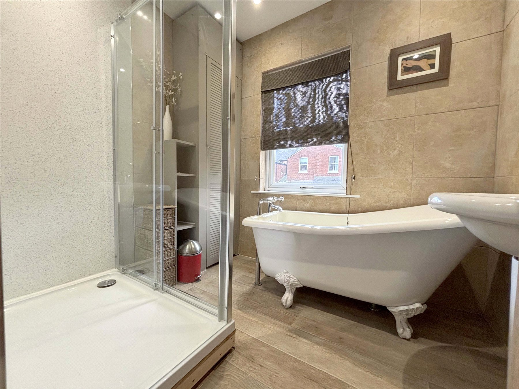 BATHROOM Fully tiled bathroom with modern white suite comprising freestanding 'claw feet' bath tub, walk-in double shower and pedestal wash hand basin. uPVC double glazed window to rear. Extractor fan. Ladder-style radiator. Airing cupboard housing boiler and shelving.