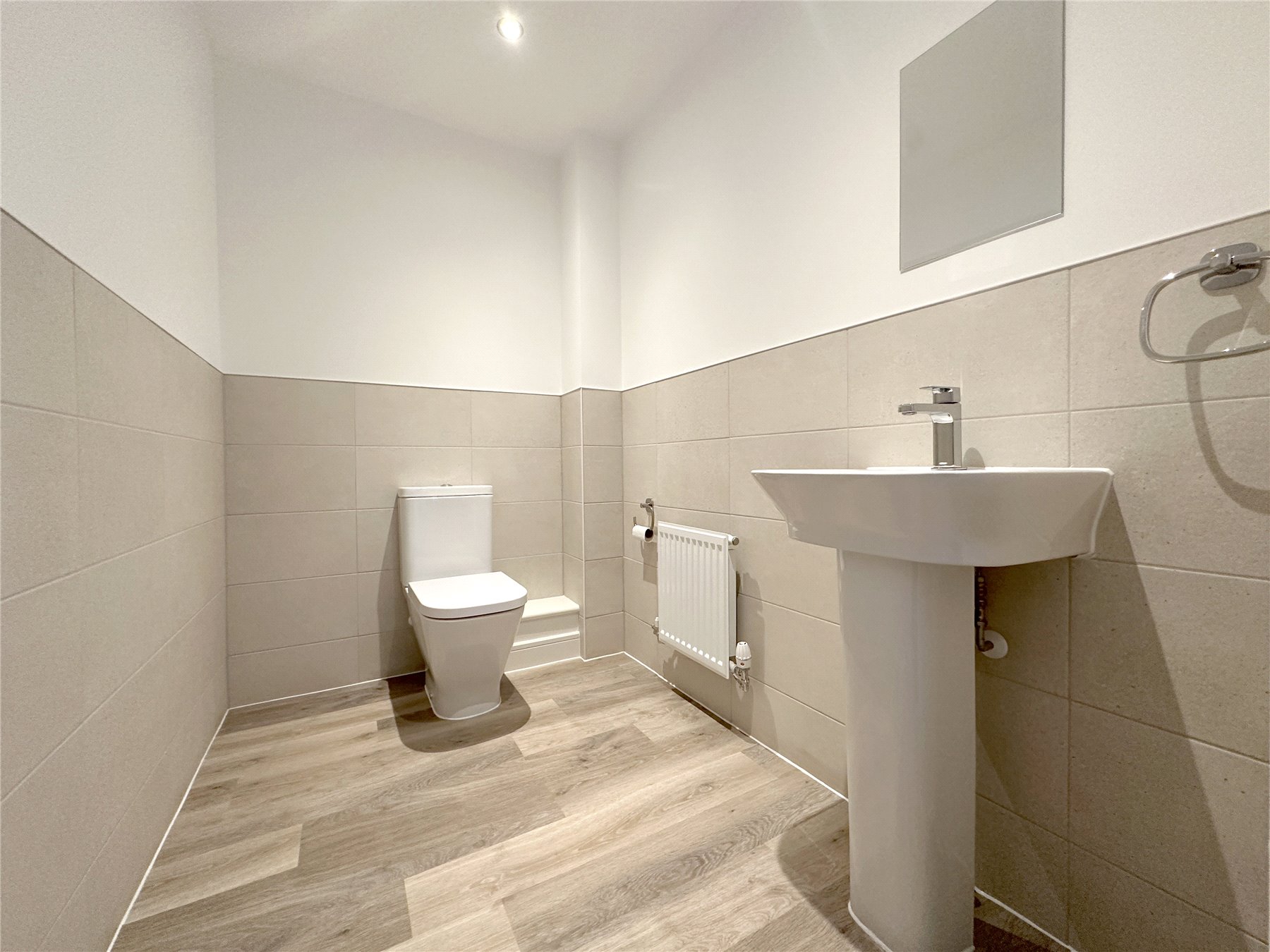 DOWNSTAIRS W/C Warm toned tiles and laminate flooring through out this WC offers-white handbasin with stainless steel mixer tap, radiator and low-level WC with push flush.