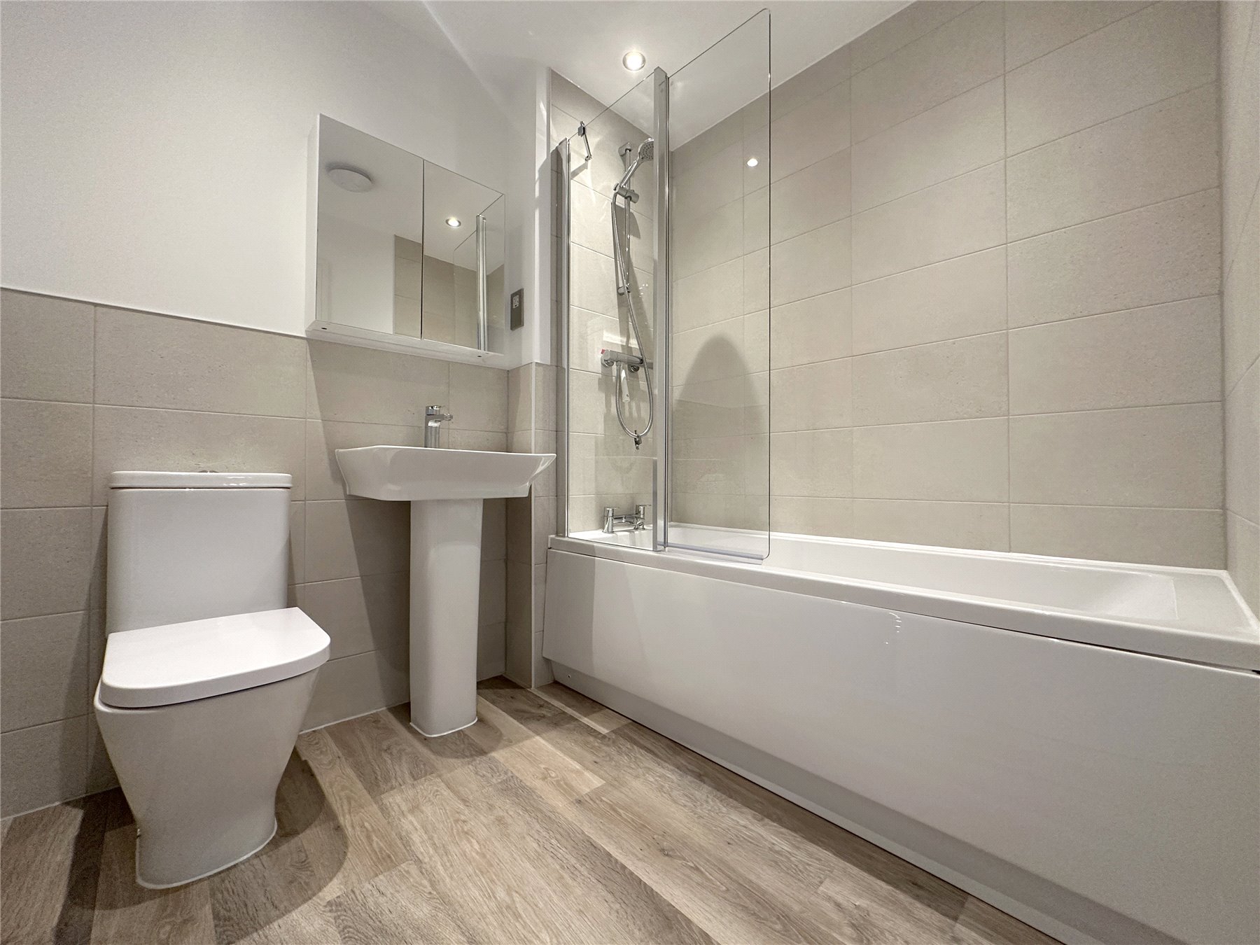 FAMILY BATHROOM With warm toned tiles and laminate flooring. This comprises of low-level WC with push flush, white hand basin sink with mixer tap. Shaver point, bath with step in shower and glass panel, heated towel rail.
