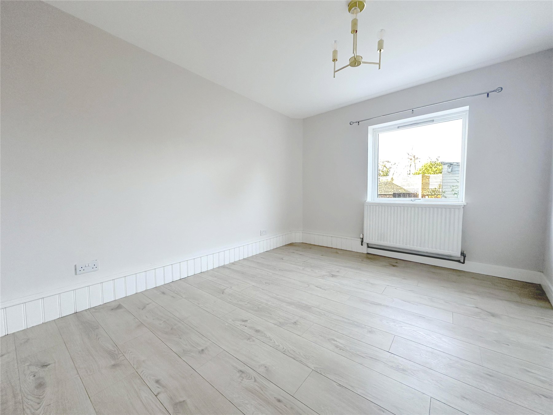 BEDROOM TWO 10'11" x 12'2" (3.33m x 3.7m). A spacious second double bedroom with a double-glazed rear window overlooking the garden. The room includes a curtain pole, radiator, multiple sockets, and is finished with laminate flooring