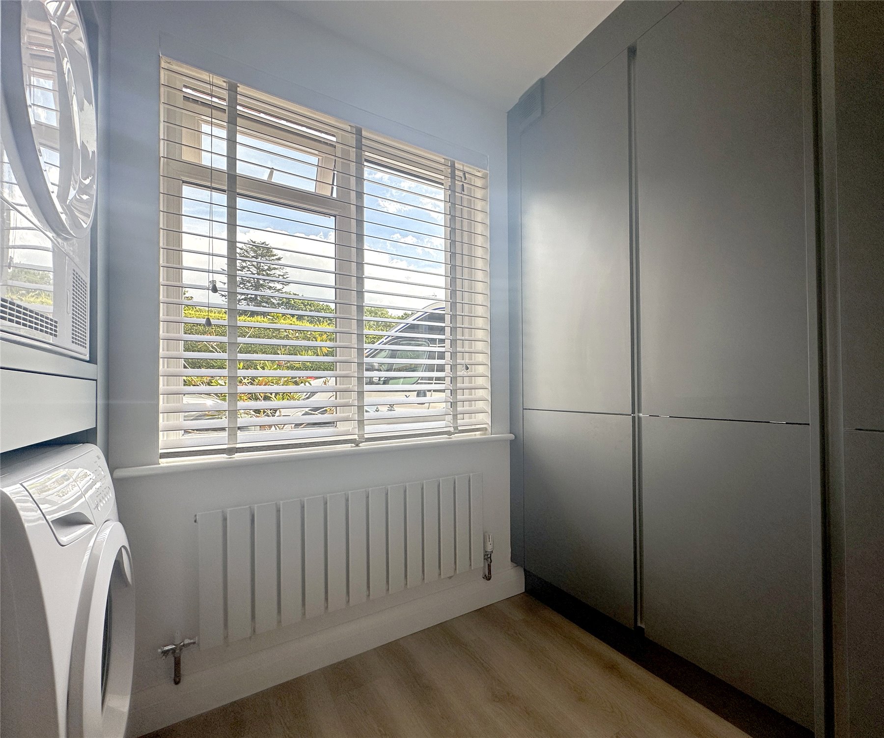 UTILITY ROOM 6'3"×6'3" (1.9m×1.9m). Double glazed windows with views to the front and slatted blinds. Blue toned wall and floor mounted cupboards and floor to ceiling pantry cupboards with an integrated freezer.