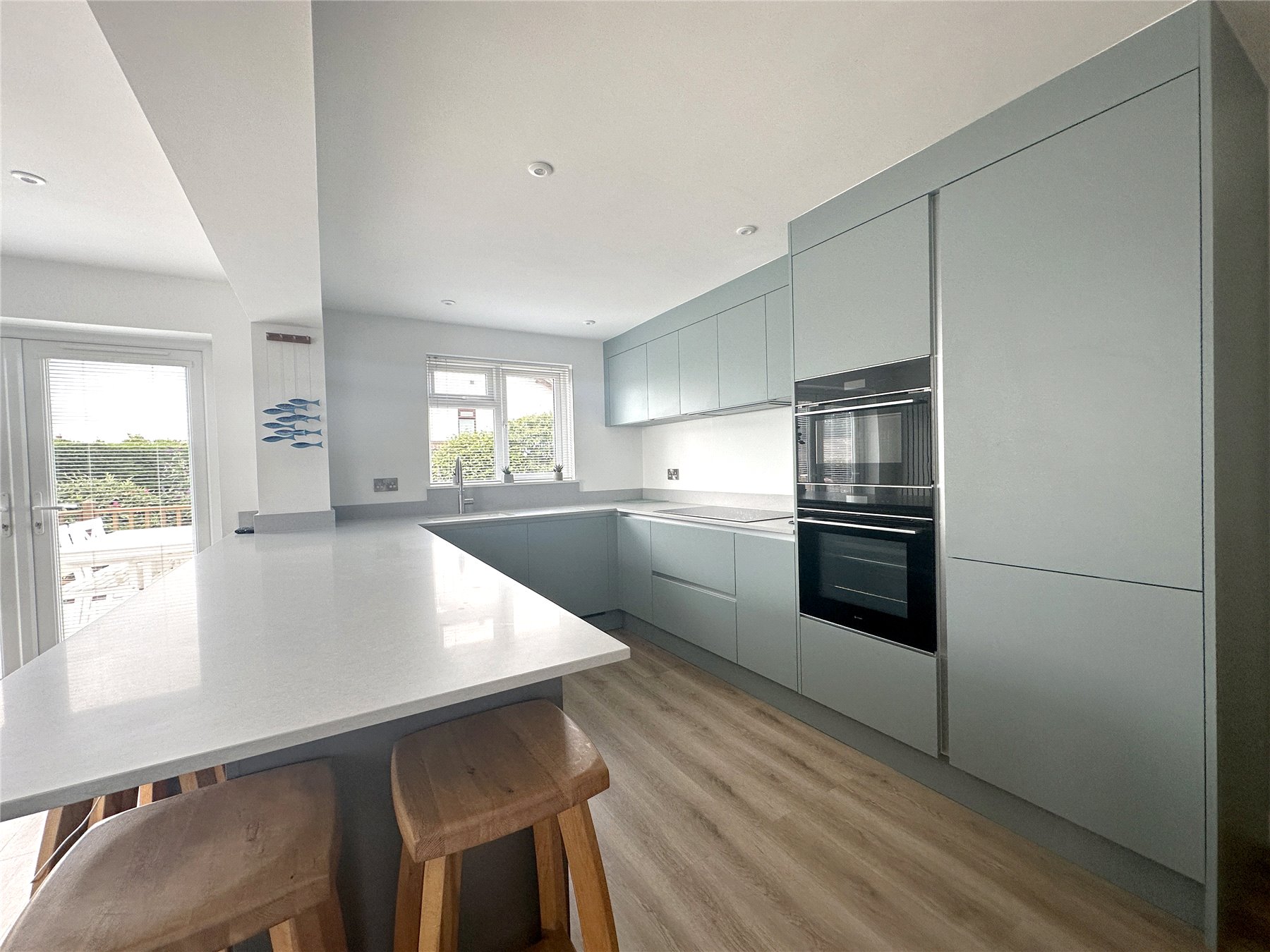 KITCHEN/DINER 16'9"×16'9" (5.1m×5.1m). A beautifully presented, modern kitchen with a range of blue toned wall and floor mounted soft close cupboards. Featuring Quooker hot tap, white inset sink with drainer and a five ring electric hob with extractor over. Caple oven, integrated fridge and dishwasher. Dual aspect windows all with fitted blinds and double door out to the decking and garden. Door leading into-