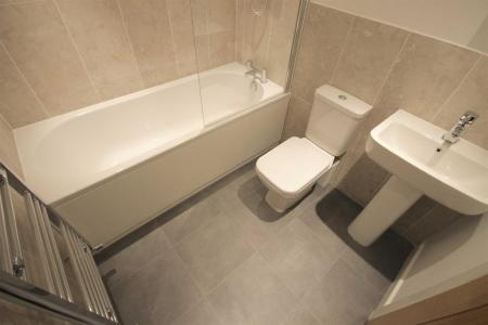 Bathroom - Smooth ceiling with inset spot lights, smooth walls, three piece white bathroom suit with low flush WC, pedestal hand wash basin, shower over bath, extractor fan, illuminated mirror, heated towel rail and lino flooring.