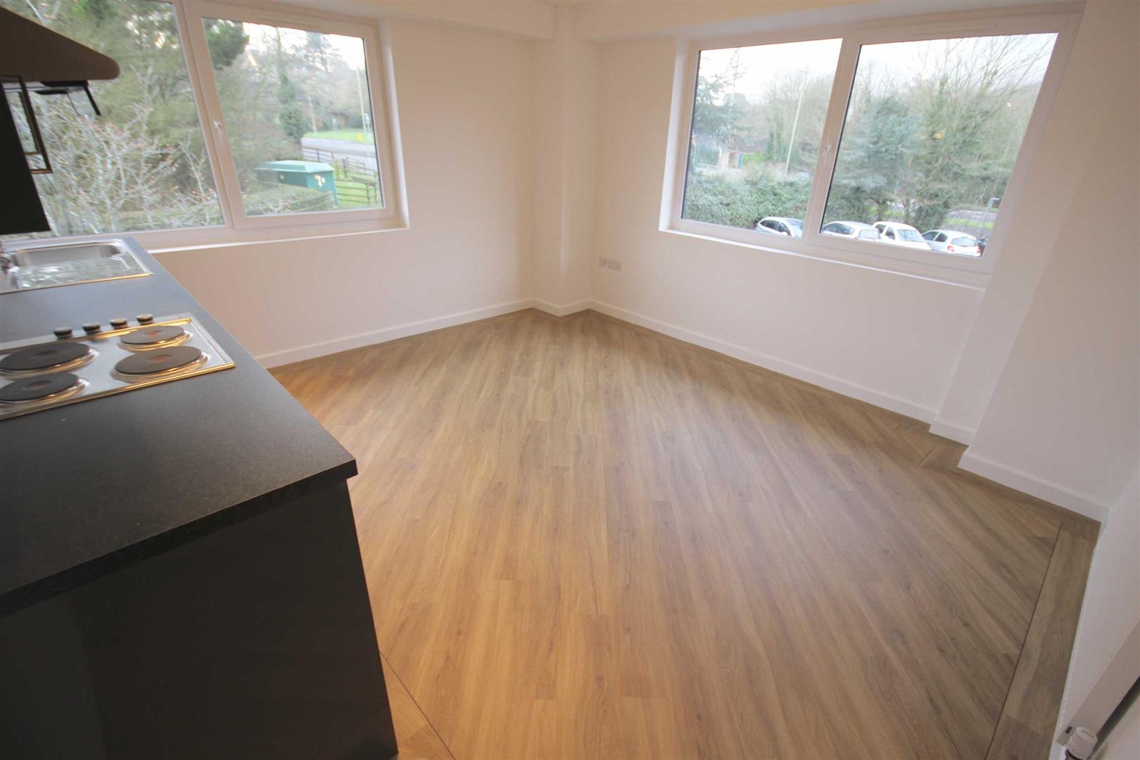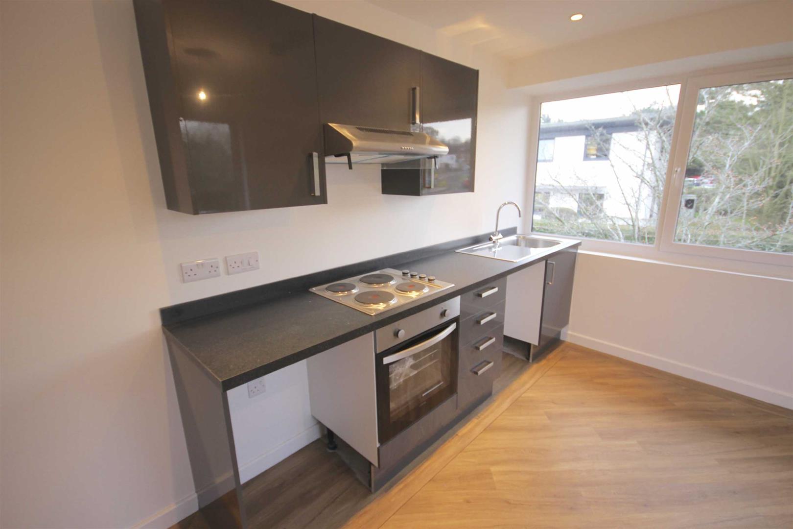 Living Room/Kitchen - Smooth ceiling and smooth walls, radiator, TV point, range of high gloss wall and base kitchen units with stainless steel sink and drainer, electric hob, electric oven, extraction unit, space for washing machine and space for a fridge.