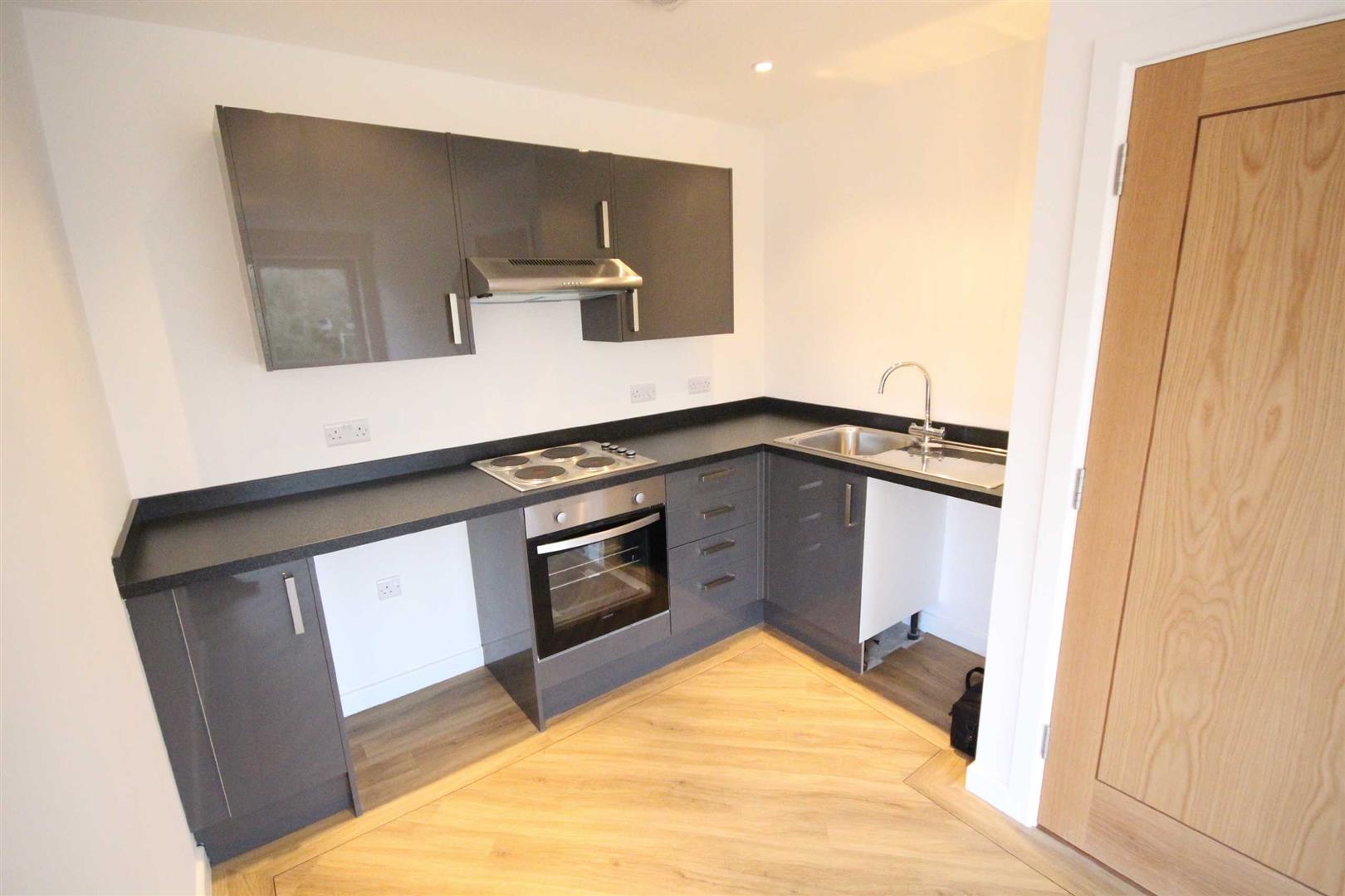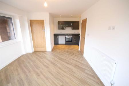 Kitchen/Living Room - 11'07 x 20'04 - Smooth ceiling, smooth walls, range of high gloss wall and base units, stainless steel sink and drainer, electric hob, electric oven, extraction unit, space for washing machine, space for fridge, windows to side and front aspects, radiator.
