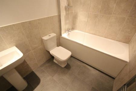 Bathroom - 5'07 x 7'11 - Smooth ceiling, smooth walls, extraction fan, heated towel rail, low flush W/C, pedestal hand wash basin, illuminated mirror, panel enclosed bath with shower over, lino floor.